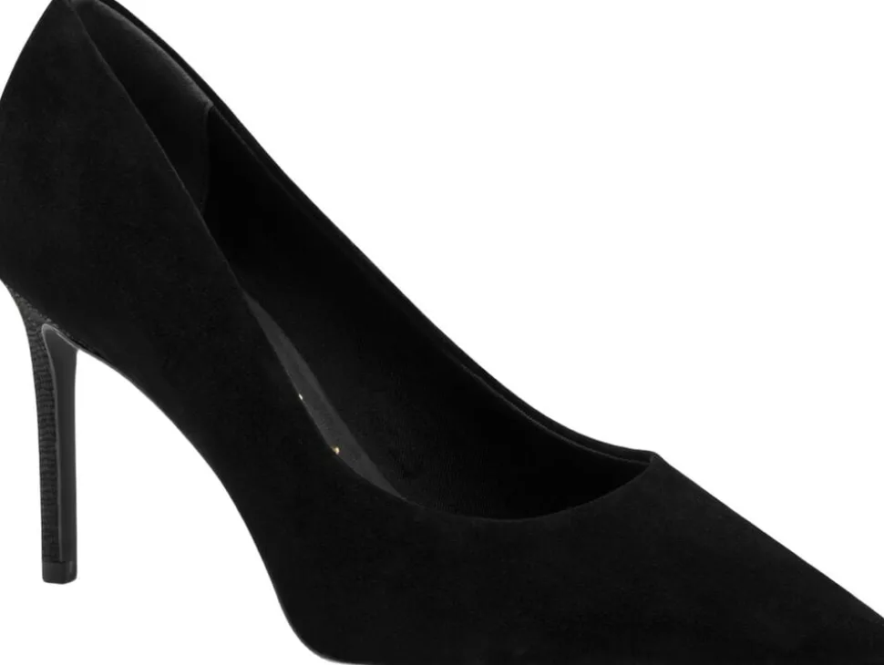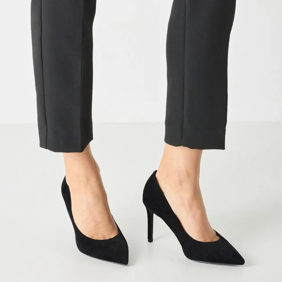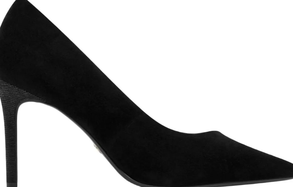 Spids sort pump i ruskinds look med præget flot stilet hæl på 90 mm. Skind foeret og med Touch it effekt i dæksålen