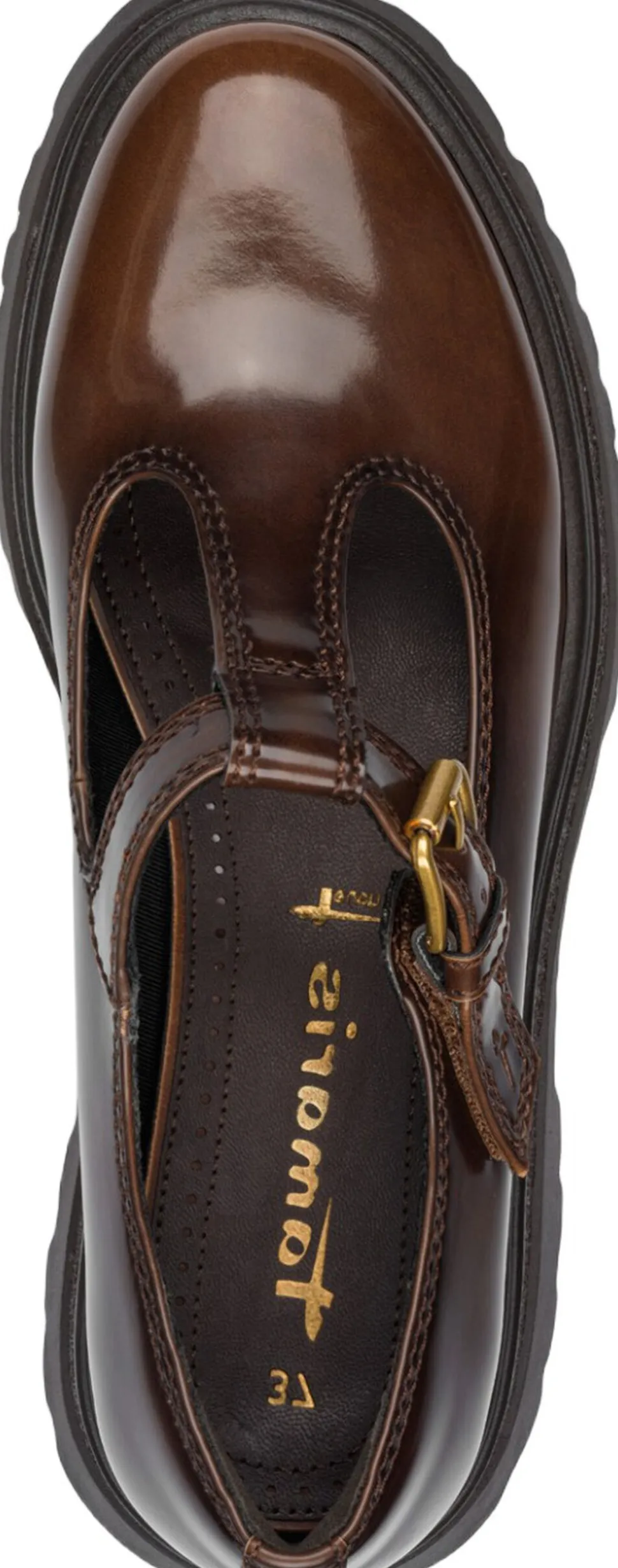 T- rems sko i muscat brun polido på en let profil sål med glimmer effekt som detalje. Lukningen er med velcro og snyde spænde