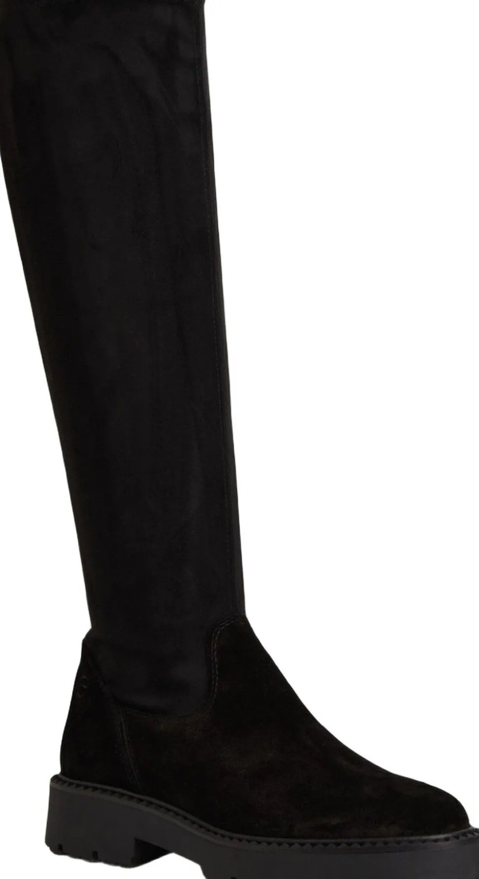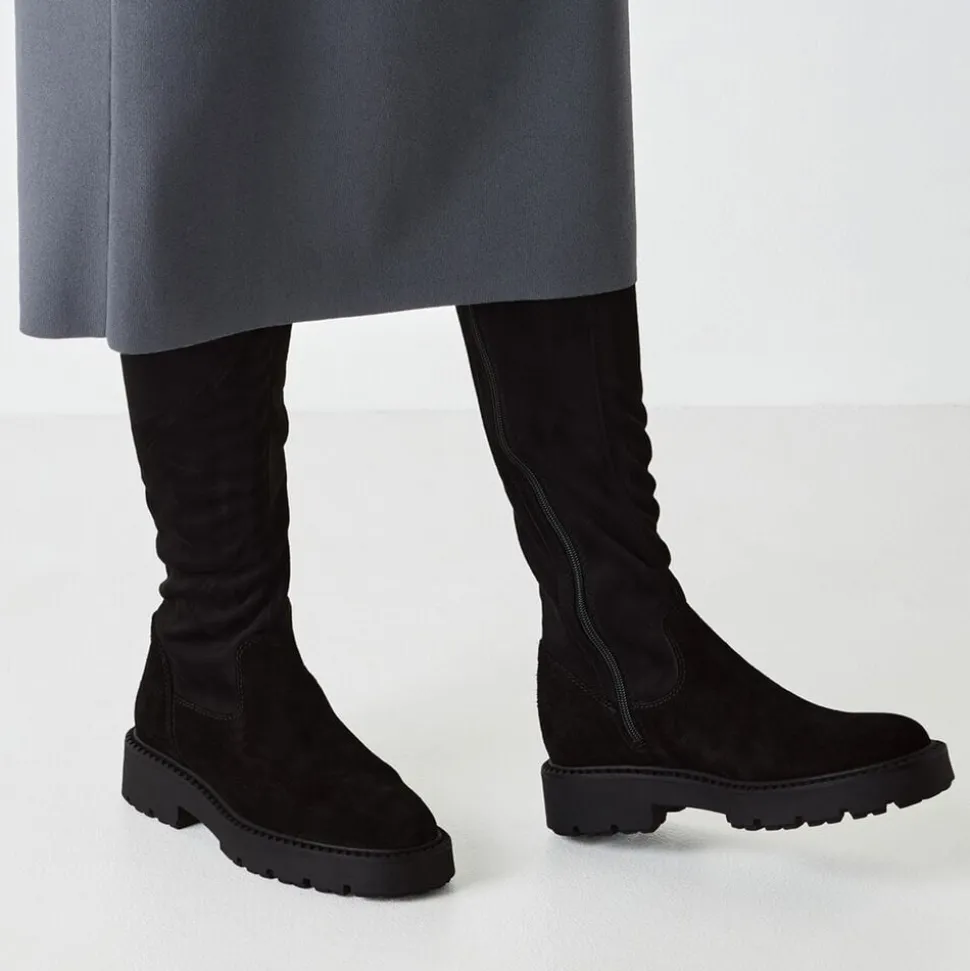 Langskaftet stretchstøvle med ruskind i foden. På en profil sål. Indvendig lynlås og skafthøjden 43 og hælhøjden 45 mm