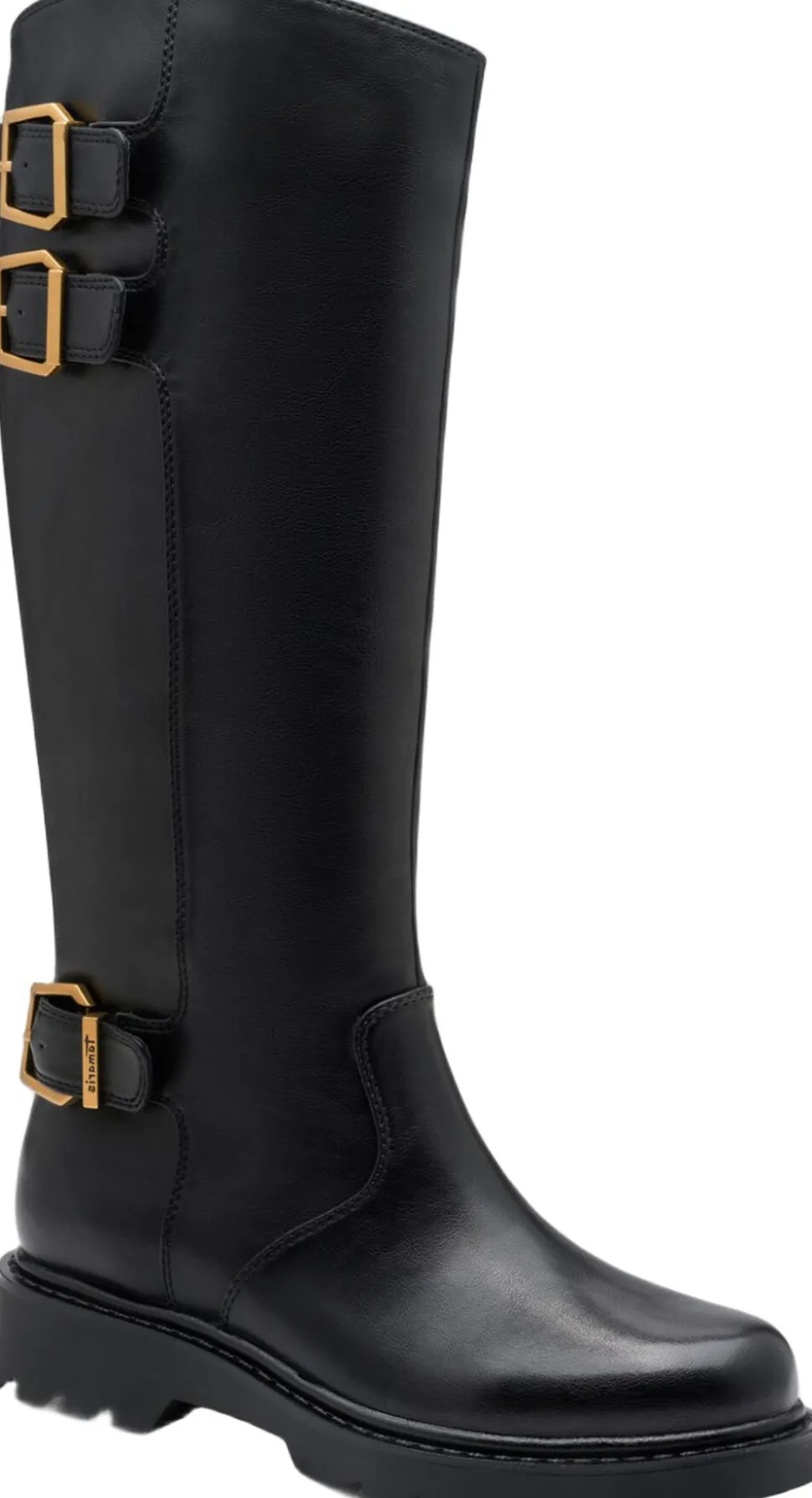 Langskaftet støvle med guldspænder og rem effekter. Sålen er let profil sål. Skafthøjden39,5 cm og hælhøjden 45 mm. Indvendig lynlås