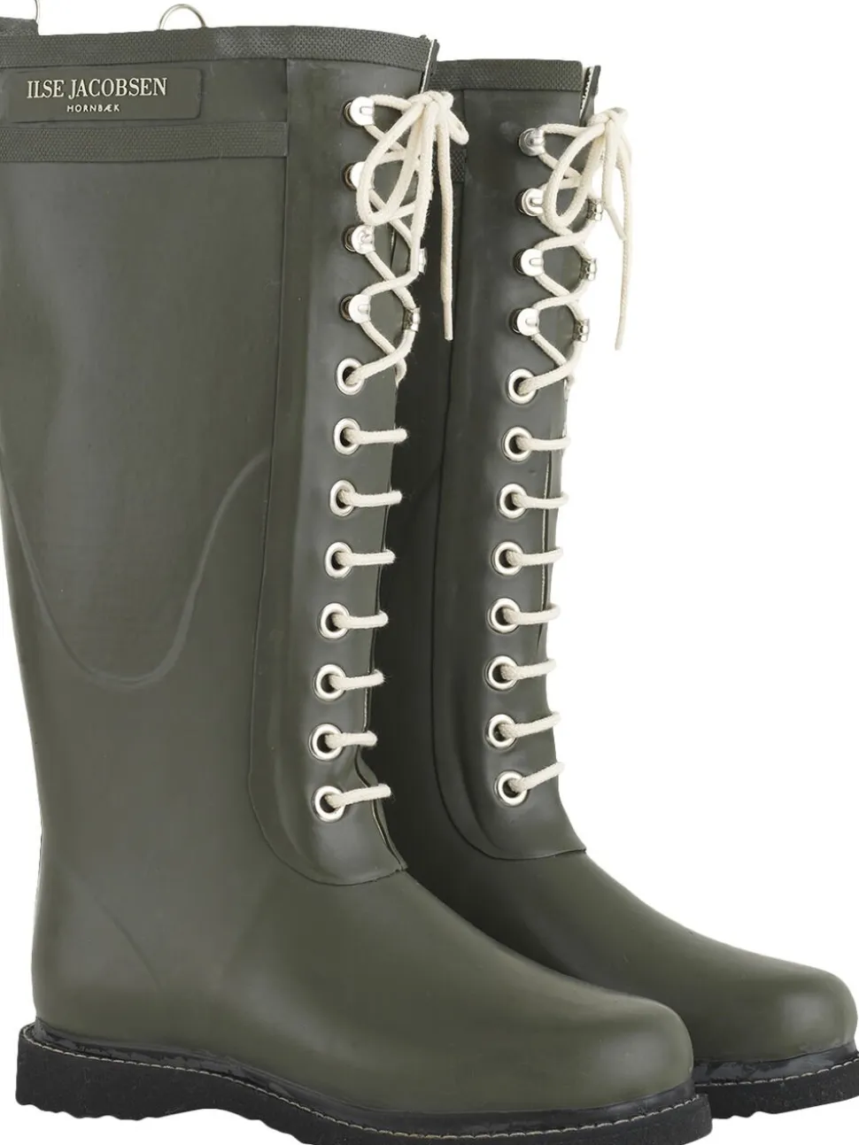 The iconic laced rubber boots by Ilse Jacobsen. These knee length rain boots features a decorative D-ring at center back and logo on the shaft. These wellingtons are made of sustainably harvested natural rubber and have been cut by hand. This material can withstand temperatures down to -20 degrees Celsius. The rubber composition is 80% pure, natural rubber and 20% secret formula. Entirely PVC-free, our boots contain no animal by-products. If not treated regularly, natural rubber will develop a white surface over the years. This is simply because the rubber will lose its essential oil. To keep your boots in great condition for many years to come, we recommend that you treat them once a month with our oil. New laces are available in several colors.
