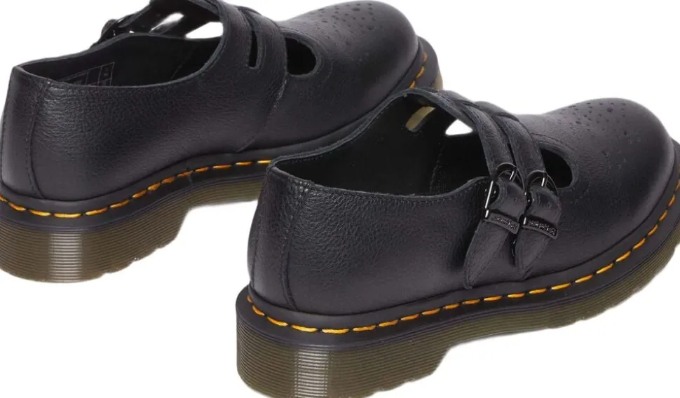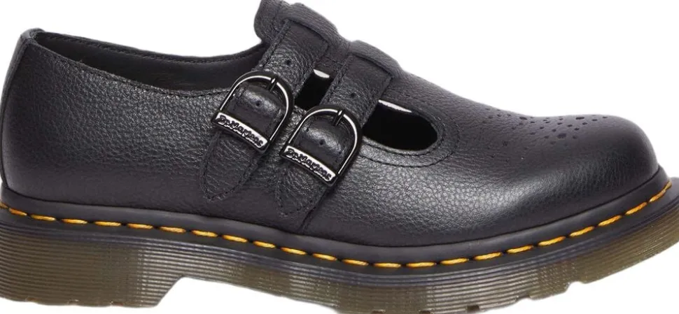 Dette er 8065: en moderne fortolkning af det klassiske skolepige-look, nu kombineret med den ikoniske og kompromisløse stil fra Dr. Martens. Skoen er designet som en elegant brogue med dobbelte remme og dekorative hestesko-spænder.