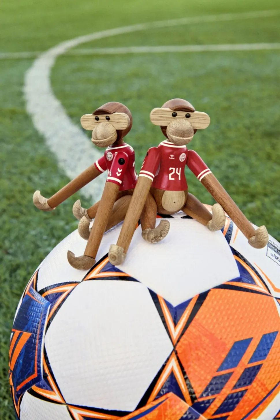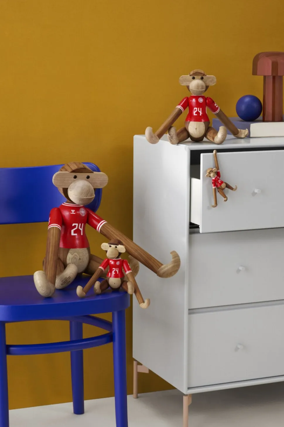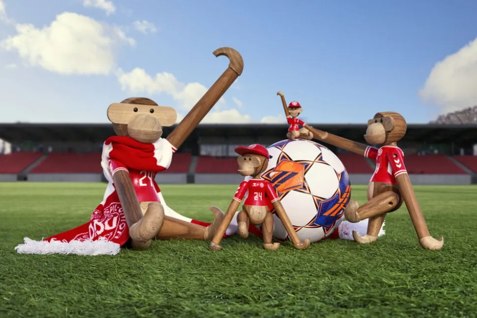 Ny holdkammerat til alle i rødt og hvidt. Med Kay Bojesen Abe x DBU er to af de største danske nationalikoner gået sammen for med humor, kreativitet og det gode håndværk at hylde sammenholdet og stoltheden over at stå sammen side om side fra leg til landshold. Og ligesom fodboldens verden byder på rækker og ligaer fra miniput til megastjerne, så kan du selvfølgelig også få Kay Bojesen Abe x DBU i den størrelse, der lige præcis passer ind i dit fanbarometer. Den mindste hedder Kay Bojesen Abe x DBU mini og udmærker sig med sine 9,5 cm i højden ved at være den mest bærbare minifan, som du kan have med dig overalt. Du bestemmer selv, om det skal være denne model med herrelandsholdets spillertrøje eller udgaven med kvindernes landsholdstrøje, som du inviterer indenfor eller måske dem begge. Du kan nemlig få Kay Bojesen Abe x DBU i to unikke varianter iklædt enten herrelandsholdets eller kvindelandsholdets flotte påmalede hjemmebanetrøjer, der begge er fortolket i tråd med figurhistorien og Kay Bojesens DNA helt ned til den mindste detalje, så de to trøjedesigns står så tæt som muligt på originalen og alligevel med deres helt eget tvist. Alle størrelser og varianter kommer i det klassiske teak og kontrolleret limbatræ. Samarbejdet med DBU sætter Kay Bojesens originale fortællinger i træ i en ny kontekst og tilføjer ydmygt og med et glimt i øjet et funklende nyt kapitel til en i forvejen smilende og levende designarv.