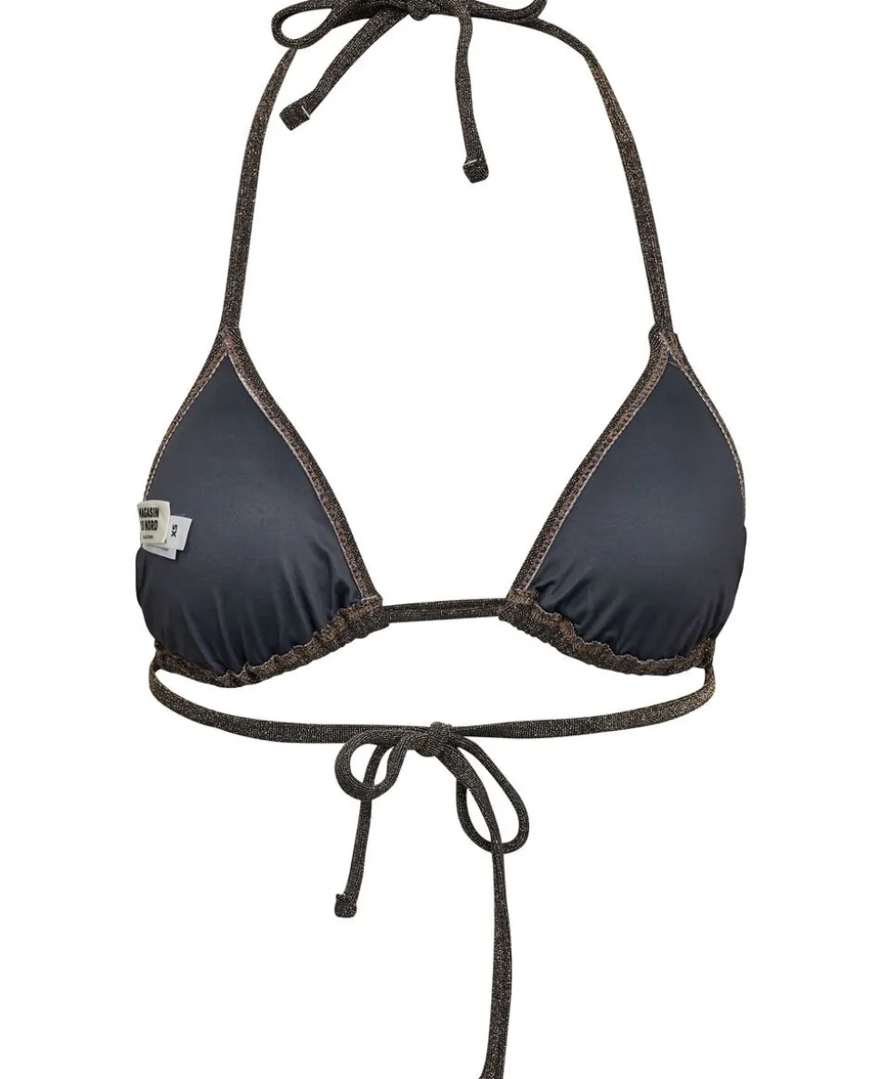 Bikinioverdel fra Magasin du Nord Collection i den smukkeste glimmerkvalitet af 50% genanvendte fibre. Overdelen er enkel i modellen med smalle elastikkanter, trekantede skåle med udtagelige indlæg samt smalle bindebånd. En detalje, der giver en flot effekt.