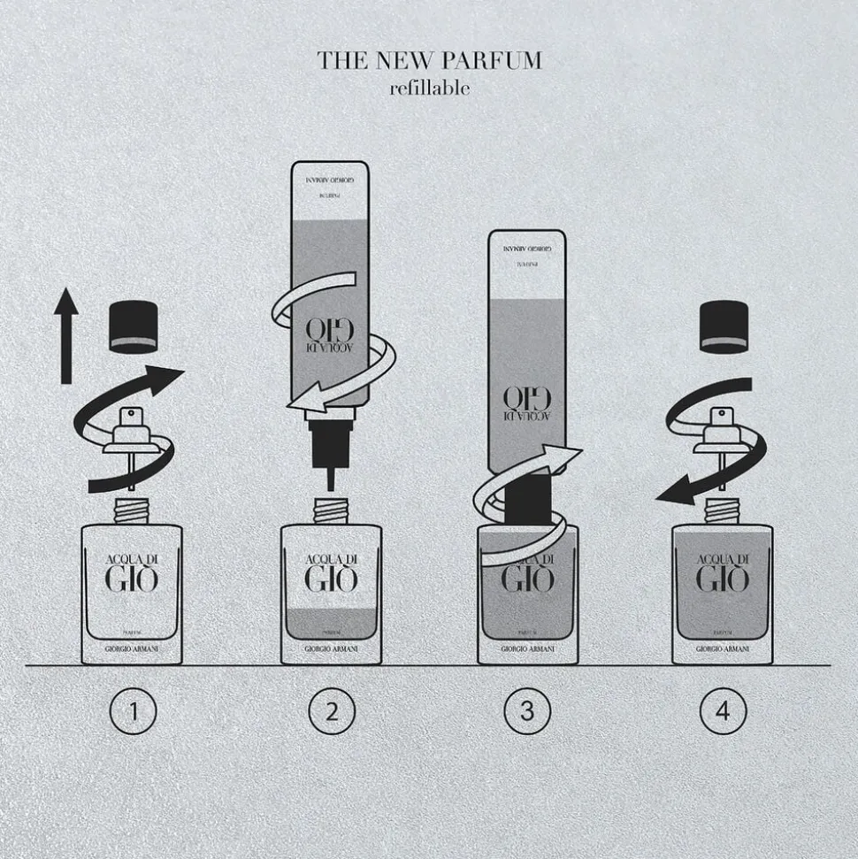 Alle størrelser af Acqua di Giò Parfum kan genopfyldes med denne refill, hvilket understreger brandets forpligtelse over for miljøet.