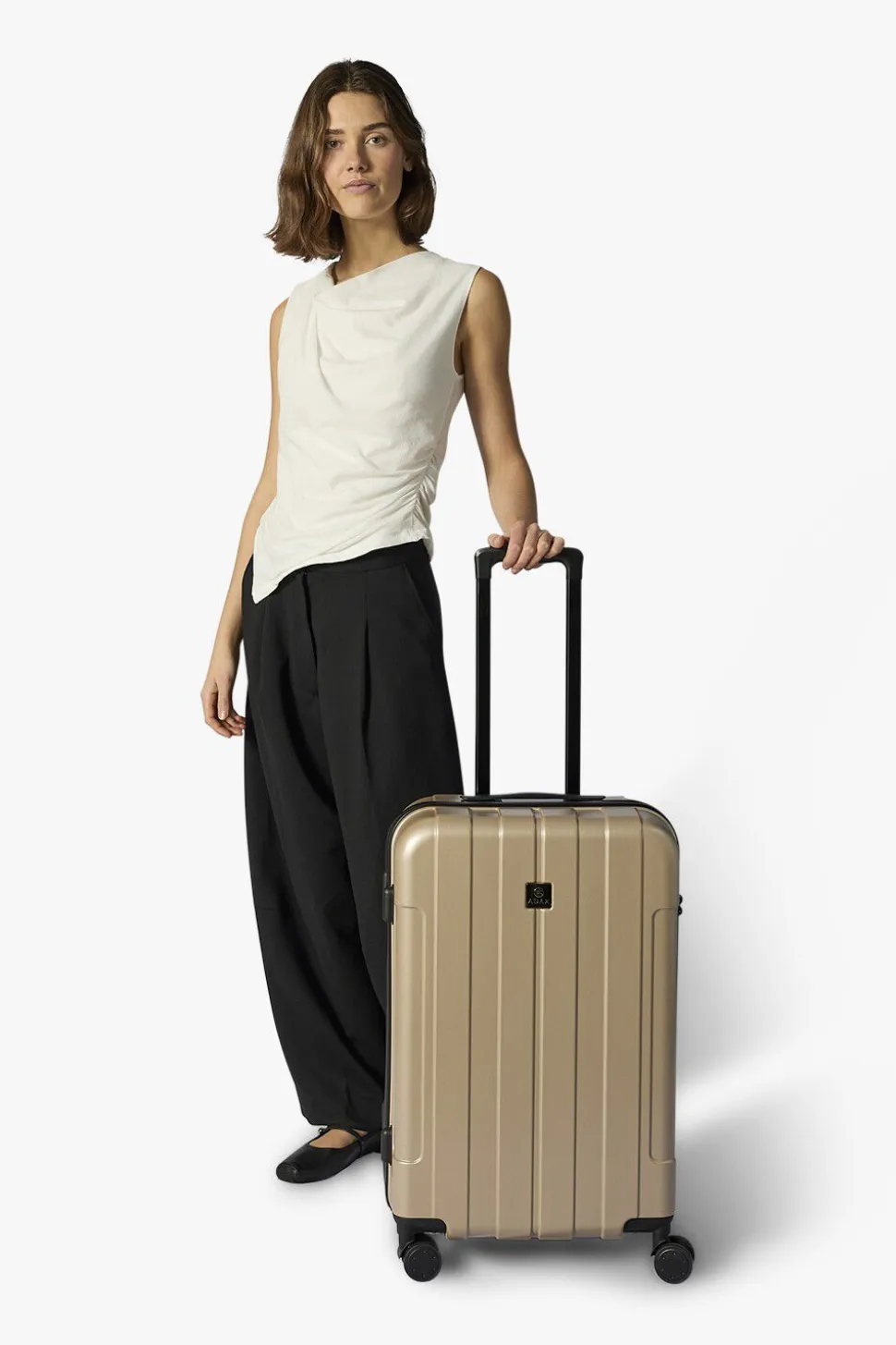 Miley 67 cm letvægts kuffert fra Adax. Tidsløs hardcase kuffert med indbygget TSA-lås, Med en TSA lås kan toldere altid tjekke din bagage hvis nødvendigt. Kufferten lukkes med 2 lynlåse. Kufferten har både håndtag i top og side samt teleskophåndtag som gør det behageligt at transportere kufferten. Kufferten har 4 dobbelhjul med 360 graders spin. Indvendig er kufferten opdelt i to store rum, i den ene side med et et elastisk krydsbånd, som holder tøjet på plads. Rummene er adskilt af en en praktisk lynlås lomme som holder styr på alle småtingene du har med på rejse. Lommen holdes fast med en lynlåslukning. Foeret er produceret i recycled materiale. Miley 67 cm letvægts kabinekuffert fra Adax. Tidsløs hardcase kuffert med indbygget TSA-lås, Med en TSA lås kan toldere altid tjekke din bagage hvis nødvendigt. Kufferten lukkes med 2 lynlåse. Kufferten har både håndtag i top og side samt teleskophåndtag som gør det behageligt at transportere kufferten. Kufferten har 4 dobbelhjul med 360 graders spin. Indvendig er kufferten opdelt i to store rum, i den ene side med et et elastisk krydsbånd, som holder tøjet på plads. Rummene er adskilt af en en praktisk lynlås lomme som holder styr på alle småtingene du har med på rejse. Lommen holdes fast med en lynlåslukning. Foeret er produceret i recycled materiale. Miley 67 cm letvægts kabinekuffert fra Adax. Tidsløs hardcase kuffert med indbygget TSA-lås, Med en TSA lås kan toldere altid tjekke din bagage hvis nødvendigt. Kufferten lukkes med 2 lynlåse. Kufferten har både håndtag i top og side samt teleskophåndtag som gør det behageligt at transportere kufferten. Kufferten har 4 dobbelhjul med 360 graders spin. Indvendig er kufferten opdelt i to store rum, i den ene side med et et elastisk krydsbånd, som holder tøjet på plads. Rummene er adskilt af en en praktisk lynlås lomme som holder styr på alle småtingene du har med på rejse. Lommen holdes fast med en lynlåslukning. Foeret er produceret i recycled materiale.