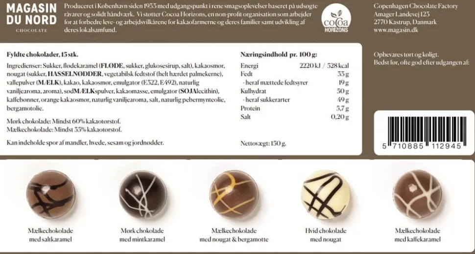 Fyldte chokolader fra Magasin du Nord Chocolate med 5 forskellige smagsvarianter i en dekorativ æske med 15 chokolader. Chokoladerne er produceret i Danmark og er lavet af udsøgte råvarer. Forkæl dig selv eller en du har kær med denne smukke gaveæske.