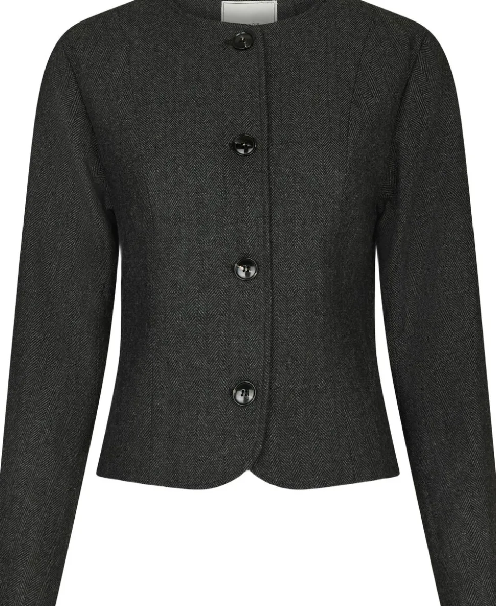 Kort jakke i herringbone-kvalitet. Jakken har rund halsudskæring, lange ærmer, rundede kanter og lukkes med knapper langs fronten. Den er lavet i en uldblanding og har en figursyet pasform. Modellen er iført størrelse 36.