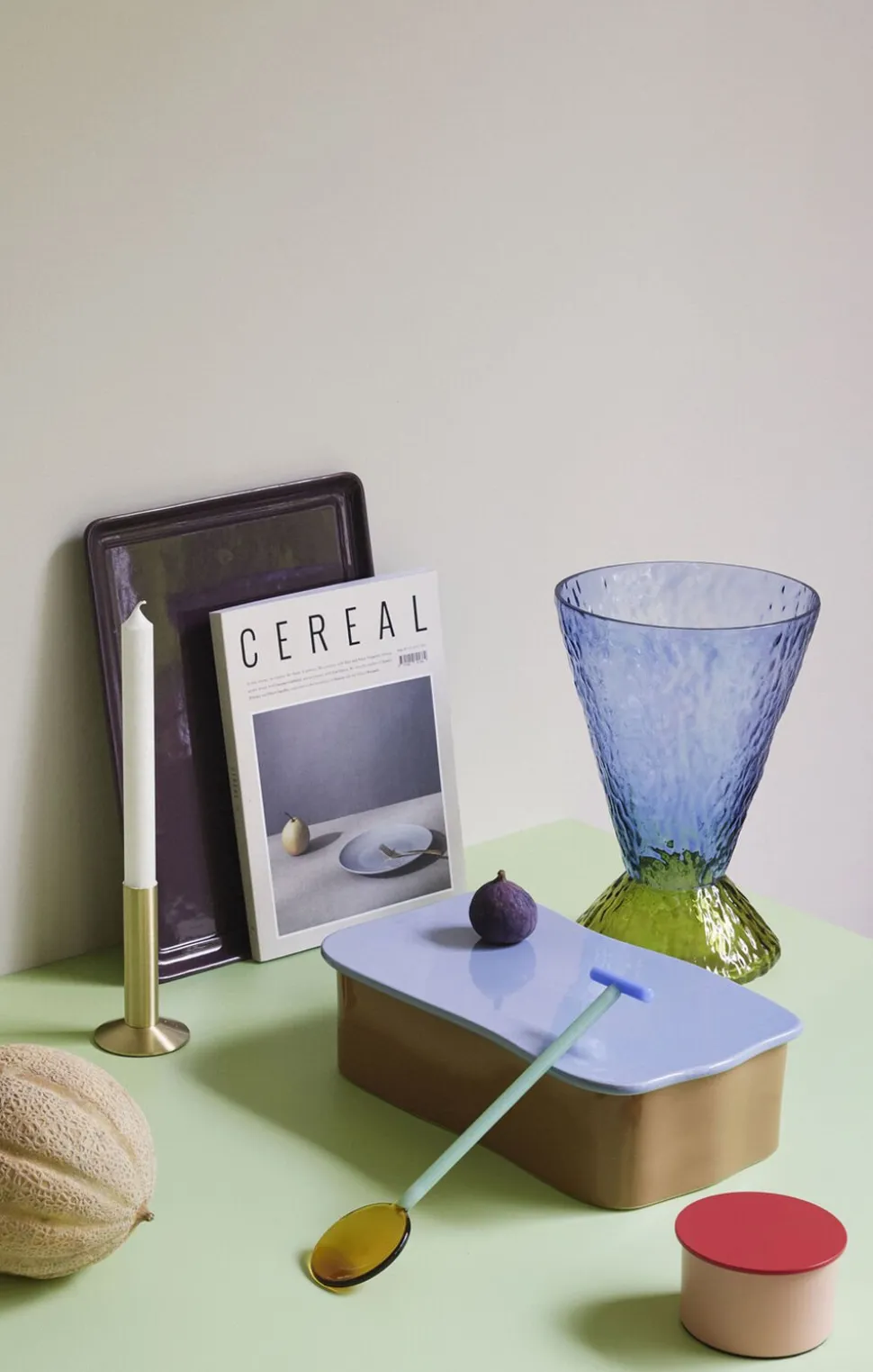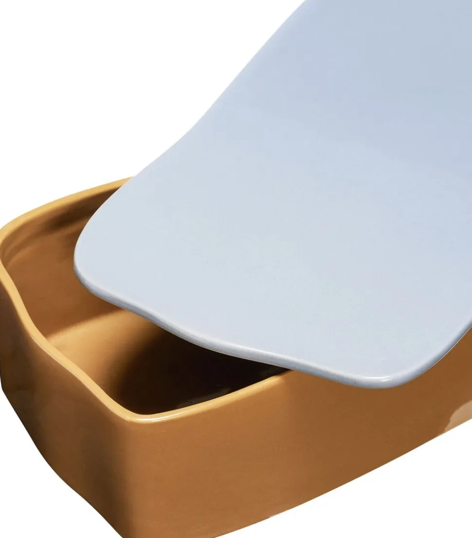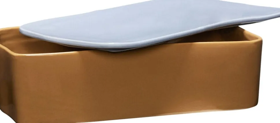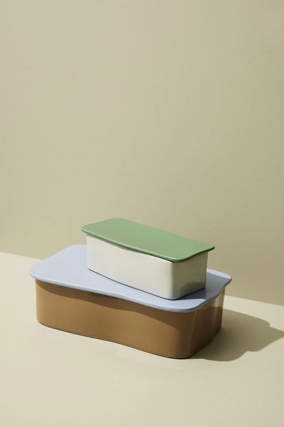 Stor opbevaringsløsning i keramik i sand med grønt låg.