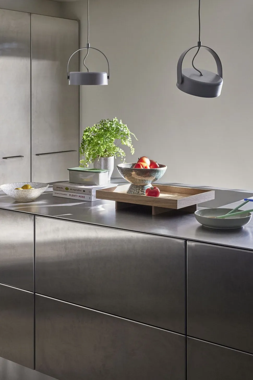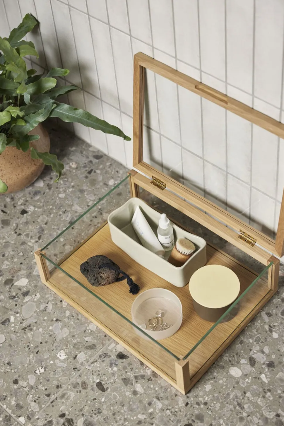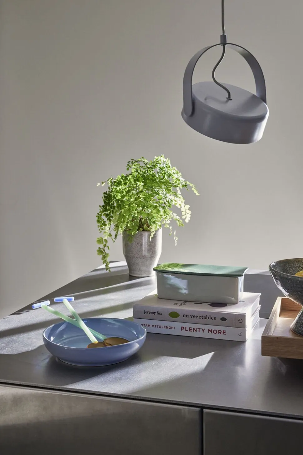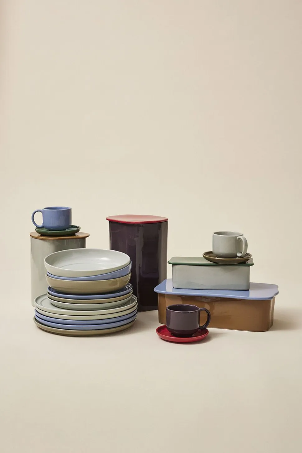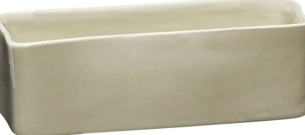 Opbevaringsløsning i keramik i sand med grønt låg.