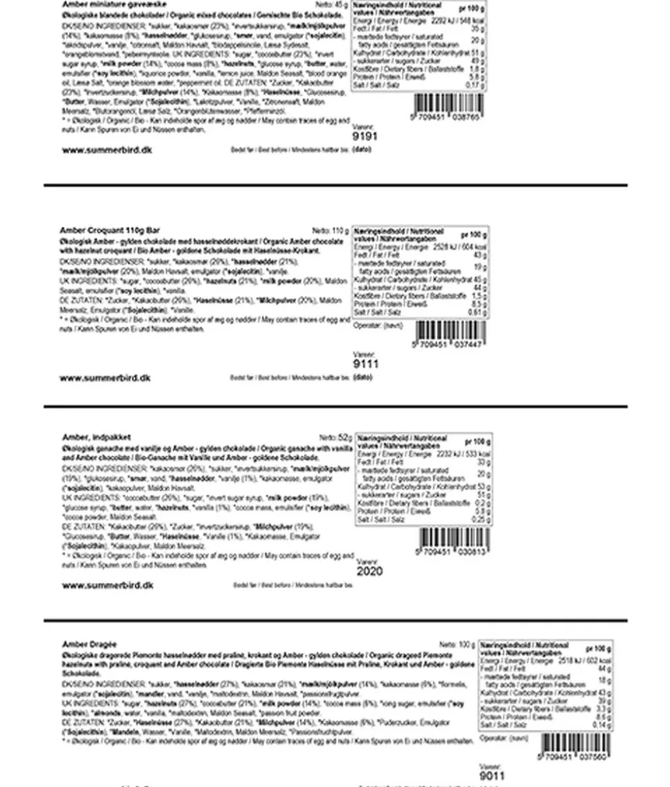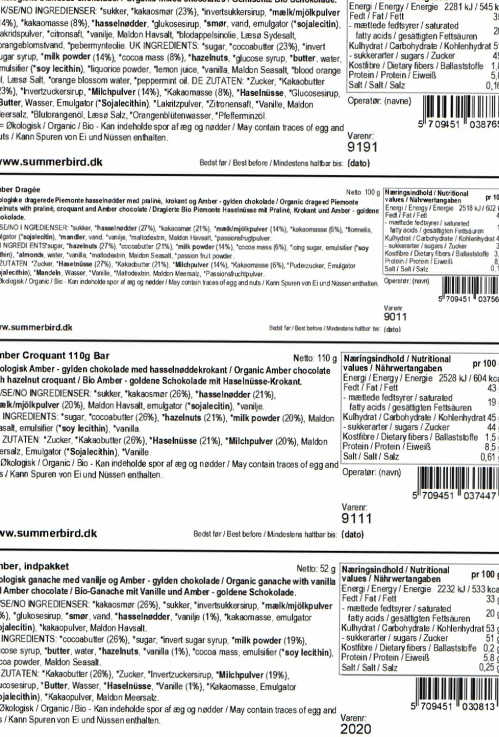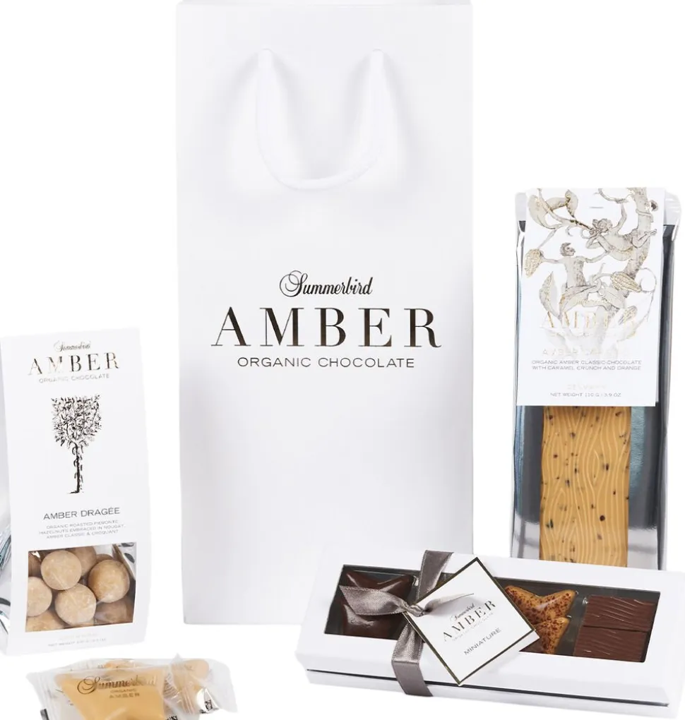 Vores Amber Classic-chokolade, som er sin helt egen, med en farve af gyldent rav, en silkeblød tekstur og en karamelliseret smag har modtaget flere guldmedaljer ved European Chocolate Awards. I en elegant og eksklusiv gavepose har vi samlet 4 af vores mest succesfulde Amber-varianter, der alle indeholder Amber Classic-chokoladen. Posen indeholder 1 stk. Amber Croquant-bar, 1 pose Amber Dragée, 4 stk. Amber-Summerbirds og 1 stk. Amber Miniature-gaveæske.
