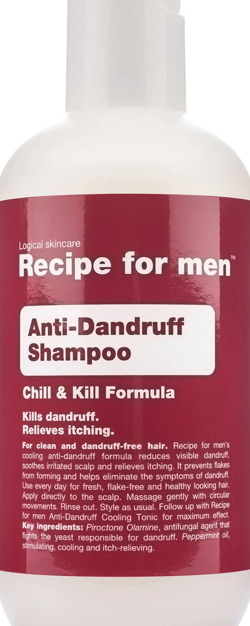 Påfør direkte i hovedbunden. Massér blidt med cirkulære bevægelser. Vent min. 2 minutter, før du skyller ud. Anvend gerne Recipe for men Anti-Dandruff Cooling Tonic efterfølgende for optimal effekt.