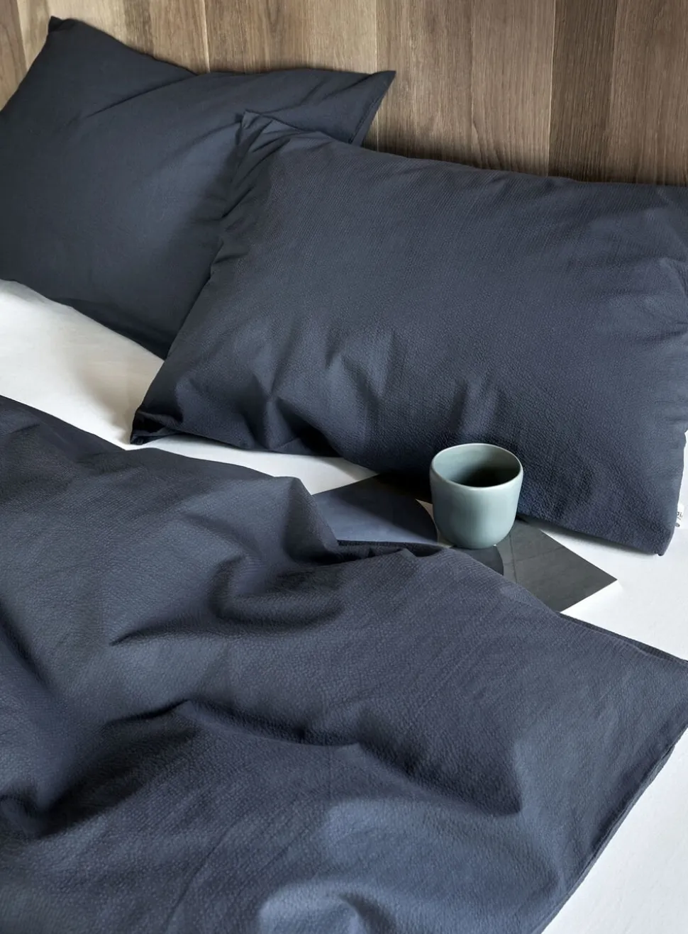 Høie Ara, sengesæt i vævet krepp/bæk & bølge. Vævet krepp opstår ved vævningen af metervaren, og effekten vil derfor aldrig forsvinde. Vævet krepp er Høies DNA. Ara er vævet af 100% bomuld og sættet er Svanemærket. Den karakteristiske struktur gør, at sengesættet føles luftigt og behageligt mod huden. Krepp fra Høie er slidstærk og strygefri. Bundåbning med lynlås i dynebetræk. Oeko-Tex Made in Green certificeret. Svanemærket.