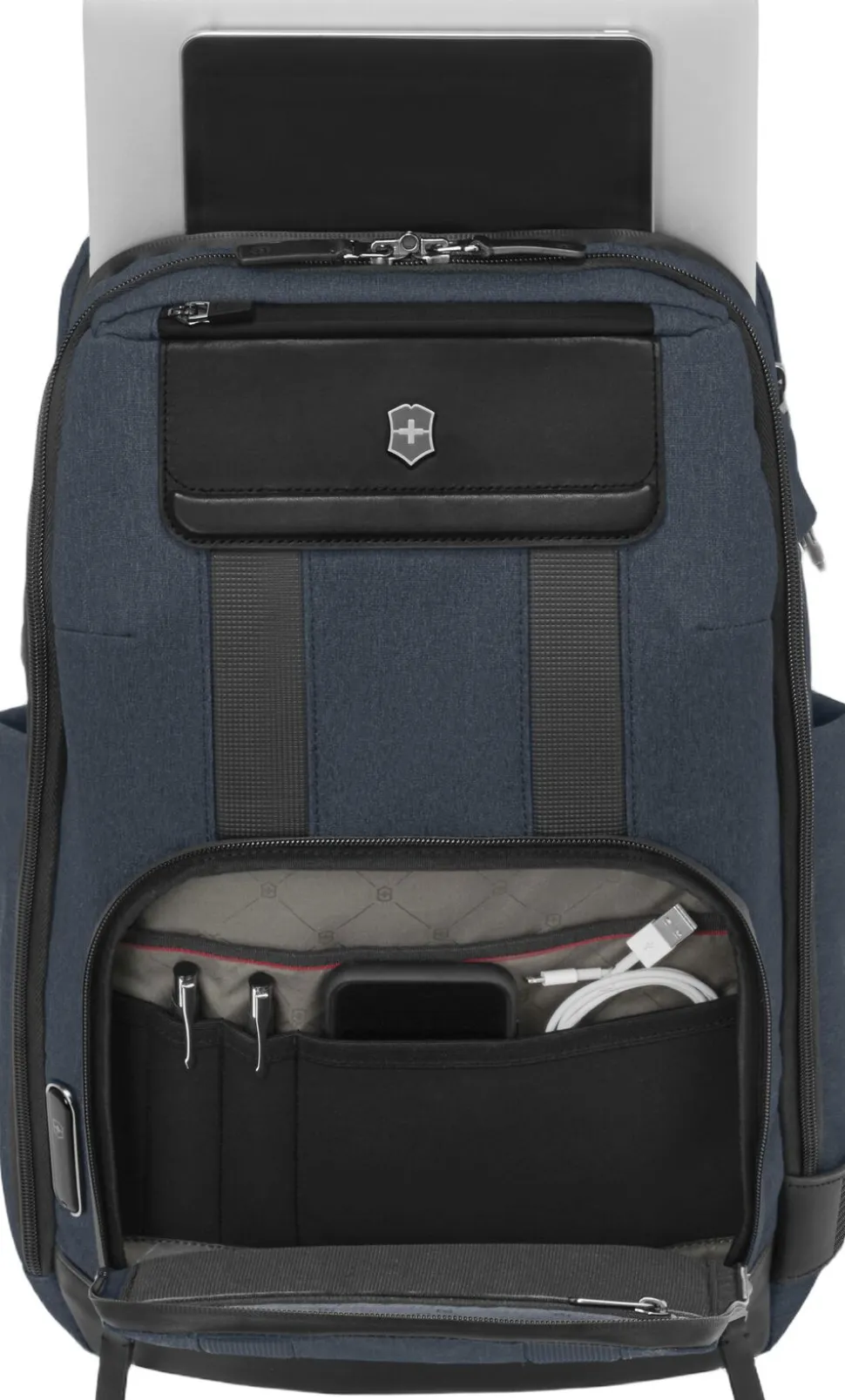 Innovativ og smart rygsæk fra Victorinox. Tasken indeholder en række praktiske rum, inklusive rum til laptop, ledninger, mobil, kuglepenne og mere. På bagsiden har tasken en strop, så den kan fastgøres til en kuffert.