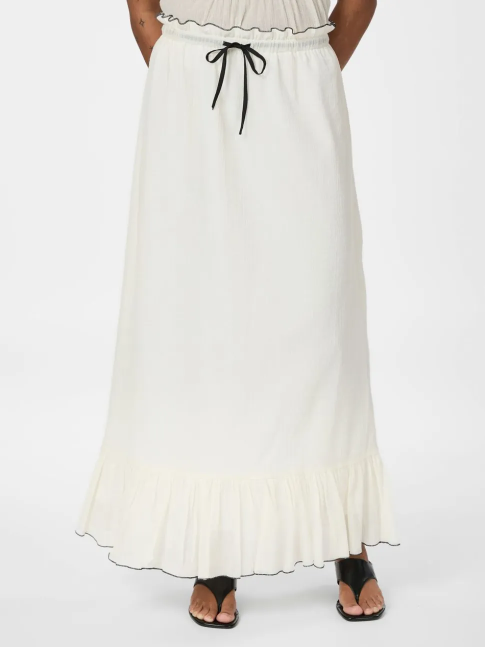 Maxi nederdel med sløjfe foran. Nederdelen har elastik og et justerbart bindebånd i taljen, kontrastbånd ved kanterne og flæser i taljen og bunden. Materialet er en let crepekvalitet. Den har en almindelig pasform og er lavet i en bomuldsblanding. Modellen er iført størrelse 36.