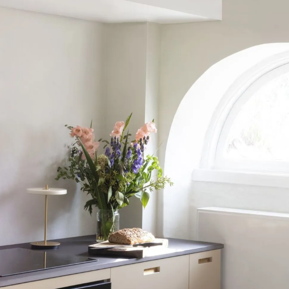 Det kan være en udfordring at finde det rigtige lys til køkkenet og gangen. Asteria Up-loftlampen tilbyder ikke kun det perfekte lys, men er også en meget diskret og stilfuld løsning. Lampeskærmen er placeret på en messingbase, der giver et raffineret udtryk til Design. Et toppanel giver også et omgivende lys opad, hvilket forbedrer Design detaljer og sikrer en blød atmosfære i det omgivende rum. Fås i medium og large i tre forskellige farver.