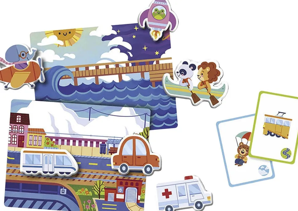 20 illustrerede temakort giver barnet mulighed for at sammenkæde hvert transportmiddel med dets miljø til lands, til vands eller i luften.