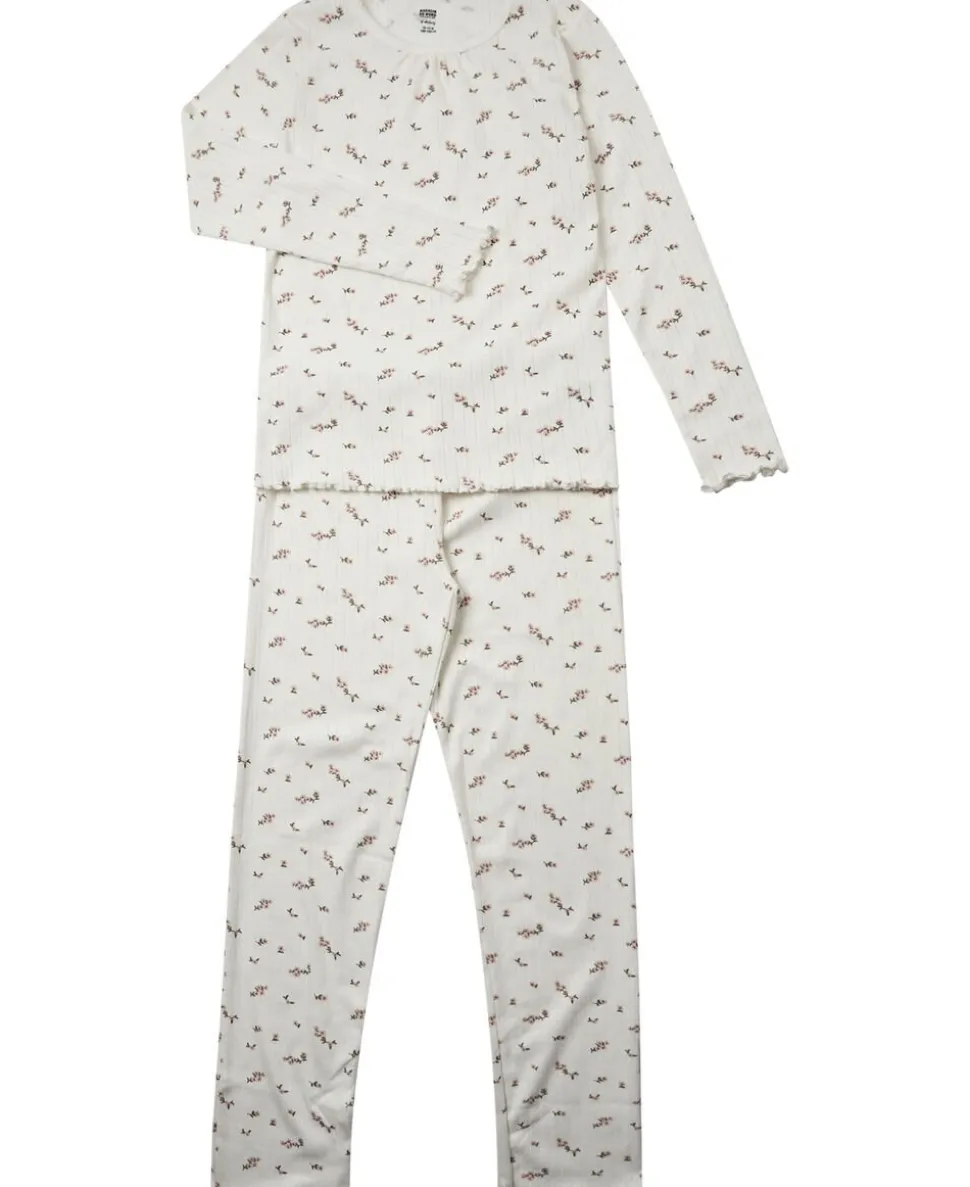 2-pak pyjamassæt fra Magasin du Nord Collection i den blødeste kvalitet af 100% økologisk bomuld med GOTS-certificering. Sættet består af en langærmet bluse samt et par løse bukser. Begge i den lækreste, komfortable kvalitet med et fint hulmønster samt bølge- og blondekanter.