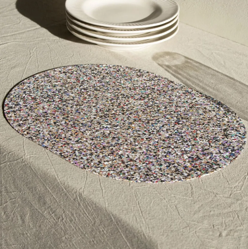 Bordbrikker fra Beach Clean-serien er lavet af en blanding af organisk kork og genanvendt EVA-plast, hvilket giver dem ikke kun et unikt udseende, men også en stærk bæredygtig profil. Sættet indeholder fire ovale bordbrikker, hver med dimensionerne 40x30x0,8 cm.