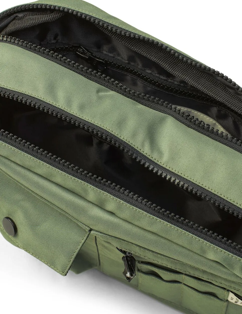 Crossbody-taske med en bred, justerbar logorem, lynlås, to indvendige rum med inderlommer og tre udvendige lommer.