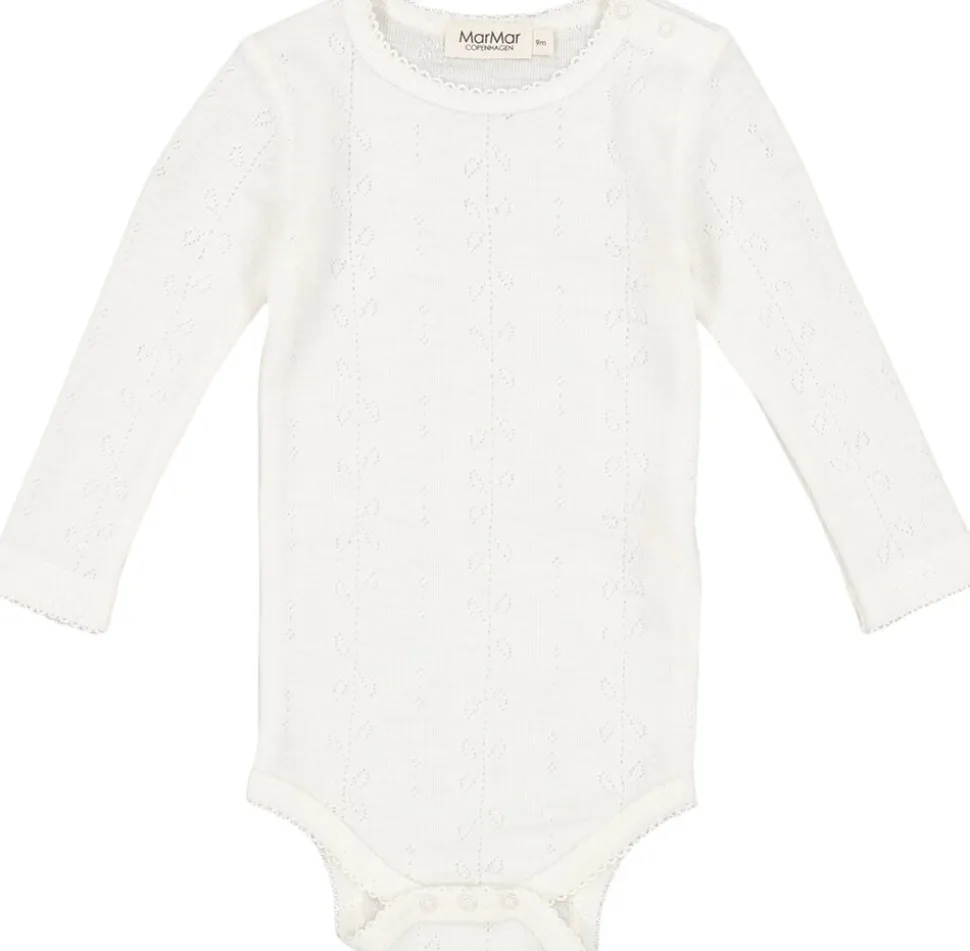 Bodystocking i en meget blød uld kvalitet med et fint hul mønster. Bodystockingen lukkes med trykknapper ved den ene skulder og i bunden.