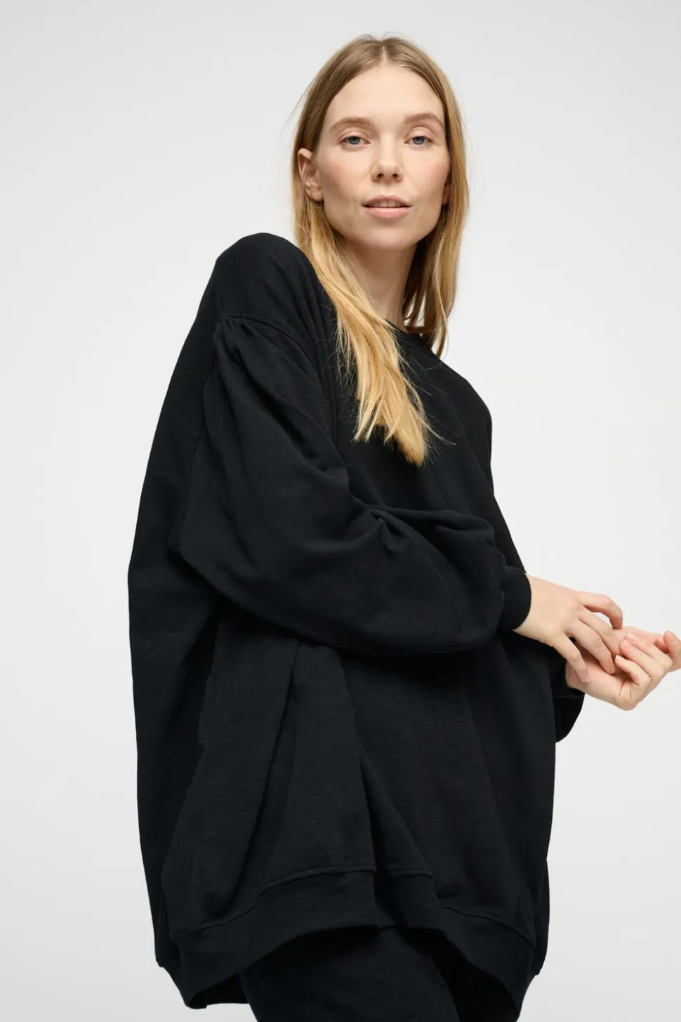 Skøn, sort oversized sweatshirt med rund hals, voluminøse ærmer og fine plisseringer ved skuldre, ryg og ærmer. Bemærk også den dekorative korsstingsdetalje fortil. Trøjen er onesize.