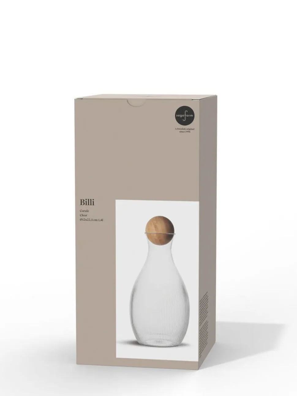 Billi-karaflen har et unikt design, hvor den karakteristiske stribe symboliserer Sagaform. Formen på Billi-karaflen er inspireret af en Sagaform-klassiker i Nature-serien. Formen er både funktionel og gennemtænkt til alsidig brug. Karaflen har en bambuskork, som også er en typisk Sagaform-detalje. Lavet af genbrugsplast (rPET). Designet i Sverige af Studio Sagaform. Håndvaskes. Kun til kolde drikke. Størrelse ø12×22,5 cm 1,4 liter