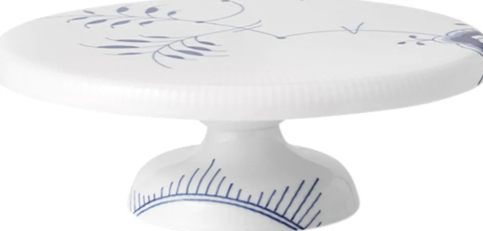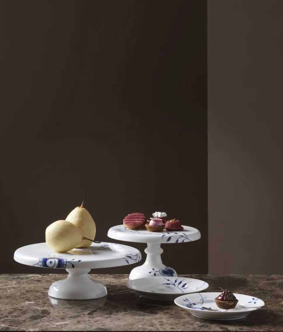 Med inspiration fra Royal Copenhagens klassiske designsprog er det nye fad på fod udsmykket med det evigt klassiske Blå Mega Riflet-mønster.
