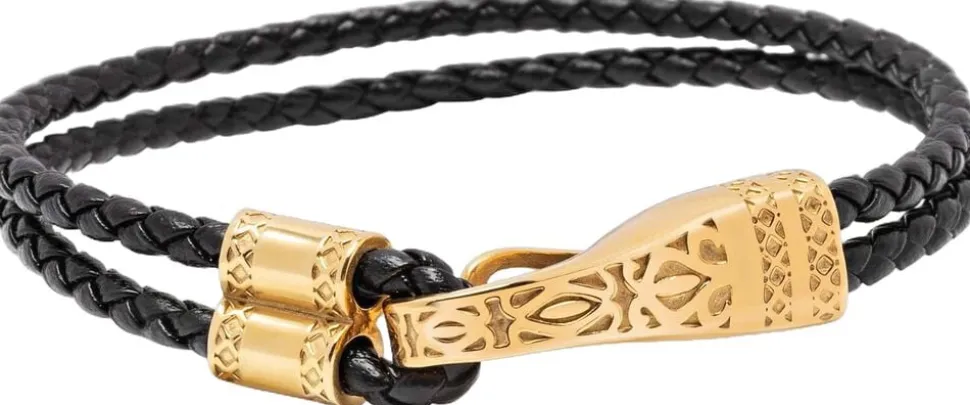 Herre-armbånd i sort læder med guldspænde, 2,5 mm sort flettet læder, spændelås i rustfrit stål med 18k guldplade. Håndlavet i Los Angeles