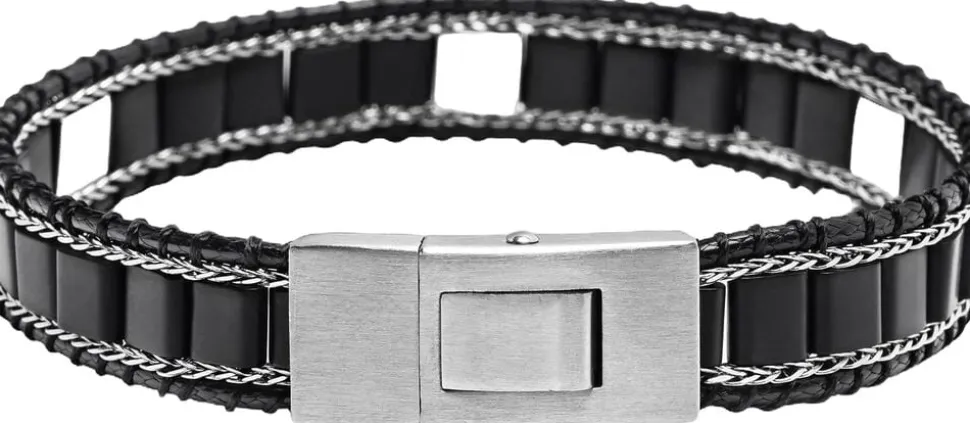 Herre Black Onyx Stud-armbånd med sølv, 10 mm armbåndsbredde, 6 mm matsorte Onyx-perler, børstet lås i rustfrit stål af høj kvalitet og stropper, vævet snor og kædedetaljer. Håndlavet i Los Angeles