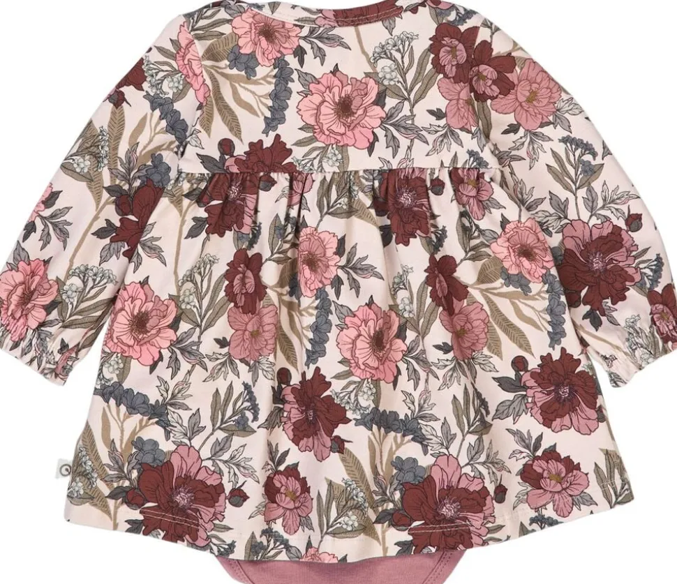 Super sød body kjole med flæser ved ærmeafslutning Body kjolen har et smukt gennemgående print af store blomster. En body kjole er smart og praktisk når man gerne vil være festligt klædt. Under kjolen er der påsyet en body underdel som hjælper til at kjolen sidder hvor den skal. Bodykjolen lukkes med tryk knapper i halseåbningen og i bunden. Fremstillet i blød og strækbar single jersey med elastan for at sikre en behagelig pasform og holdbarhed. (GOTS Organic Certified by Ecocert Greenlife Lic. No. 151714). Produktet er GOTS organic- certificeret, hvilket betyder at bomulden er certificeret økologisk, og at der i alle andre processer som farvning, strikning og syning er taget de strengeste hensyn til miljøet. GOTS er internationalt anerkendt som den førende standard for forarbejdning af tekstiler af økologisk bomuld. Derudover tages der også hensyn til arbejdsforholdene, hos dem der producerer tøjet. Økologisk bomuld 95%, Elastan 5%