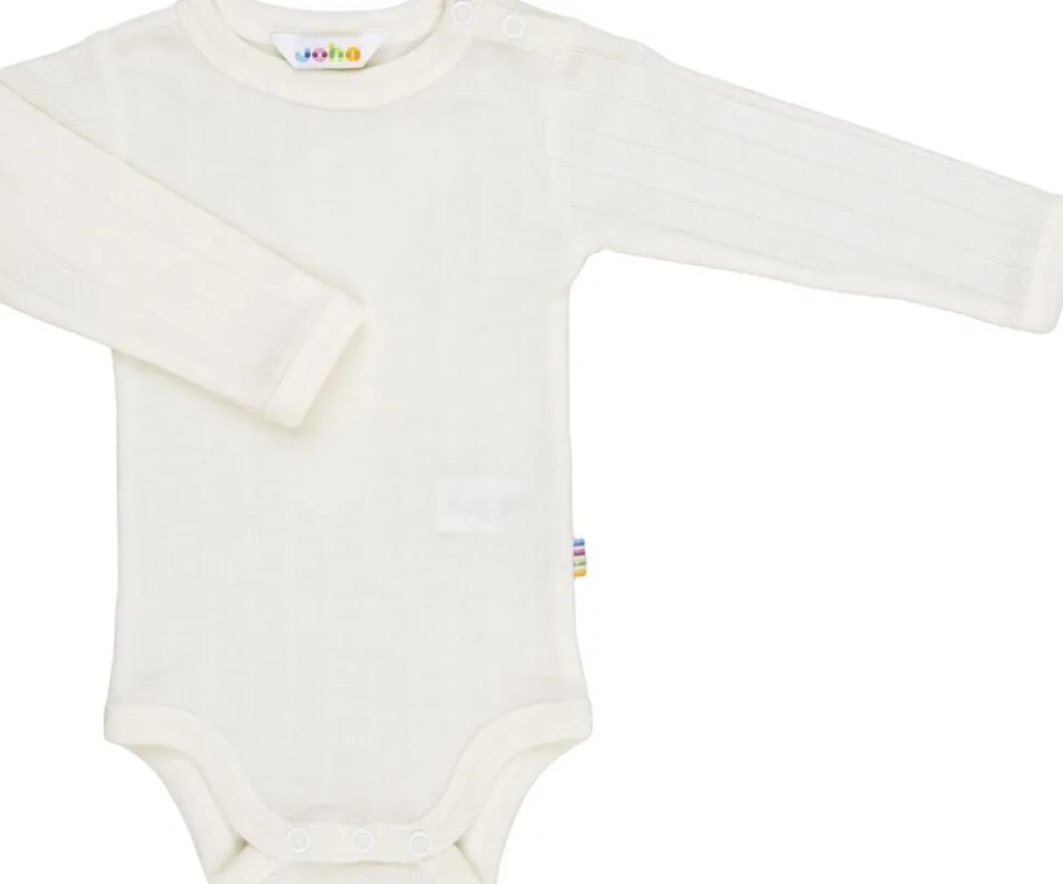 Body med lange ærmer. Trykknapper på den ene skulder samt mellem benene. En ekstra fin uldkvalitet med silke som er dejlig blød. Lodret rille mønster og et lidt skinnende udtryk gør denne kvalitet ekstra fin og lækker. Ensfarvet. Wool rich blend og Oeko-tex 100 mærket.