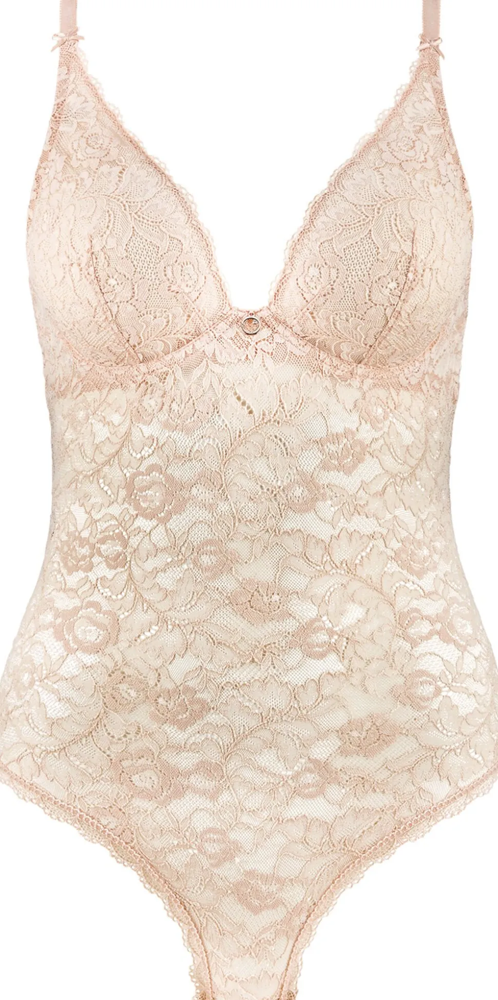 Med raffinerede blonder i et rosemønster, der yngler mod Hud, er Rosessence-bodysuitten for det meste gennemsigtig for en decideret moderne og sexet silhuet. Fuld dækning ved busten for komfort, den har en dyb halsudskæring. En meget sensuel udskæring, der elegant afslører bar Hud bagpå.