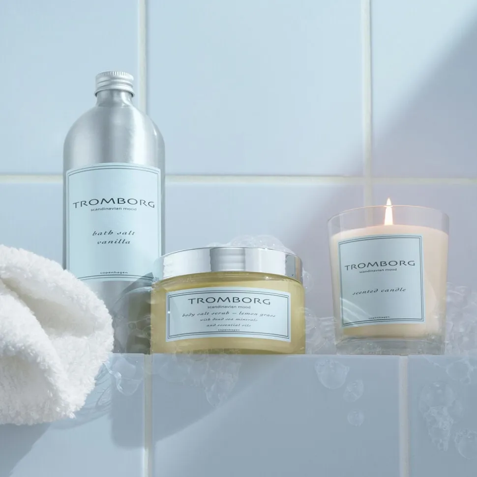 Man kan hjælpe et sundere, fornyende udseende på vej ved at exfoliere huden forsigtigt med Tromborgs Body Salt Scrub, som fjerner døde hudceller, så huden får et mere levende skær. Skrubben er blid og exfolierende med fint salt fra Det Døde Hav, mandelolie og æteriske olier.