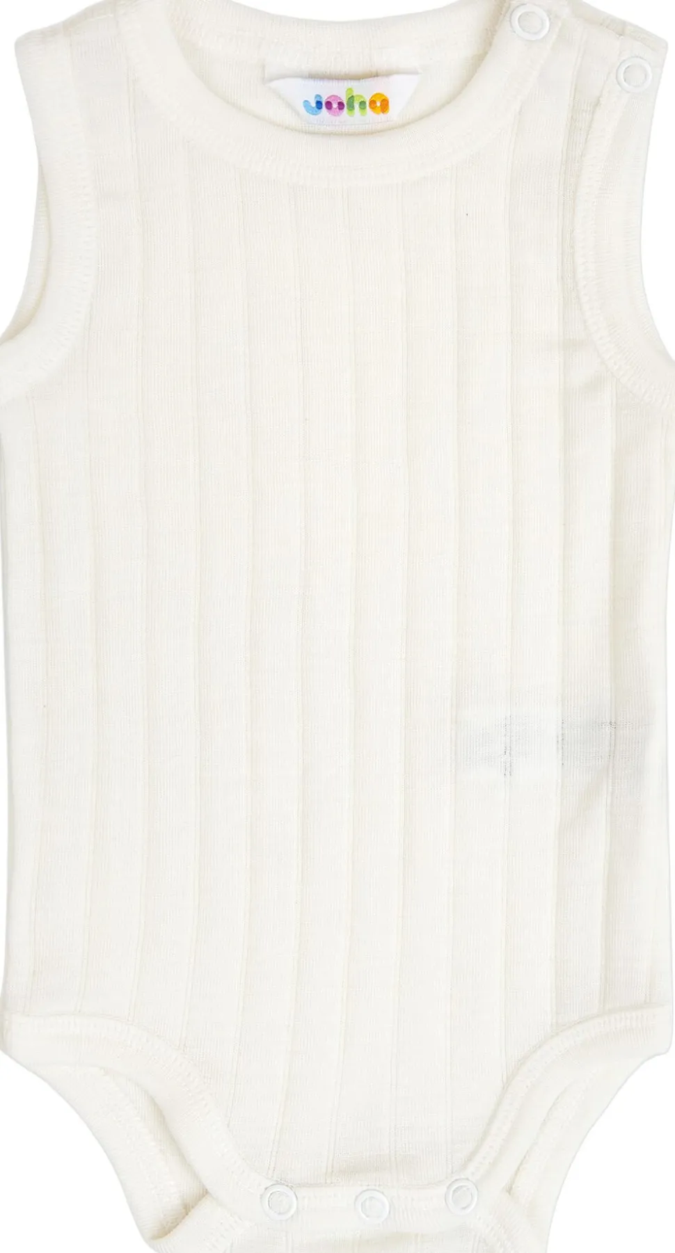 Body uden ærmer. Trykknapper på den ene skulder og mellem benene. En ekstra fin uldkvalitet med silke som er dejlig blød. Lodret rille mønster og et lidt skinnende udtryk gør denne kvalitet ekstra fin og lækker. Ensfarvet. Wool rich blend og Oeko-tex 100 mærket.