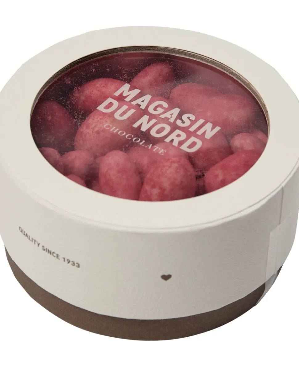 Mandeldragé fra Magasin du Nord Chocolate med hvid chokolade og hindbærpulver i en dekorativ æske. Mandeldragén er produceret i Danmark og er lavet af udsøgte råvarer. Forkæl dig selv eller en du har kær med denne fine gaveæske.