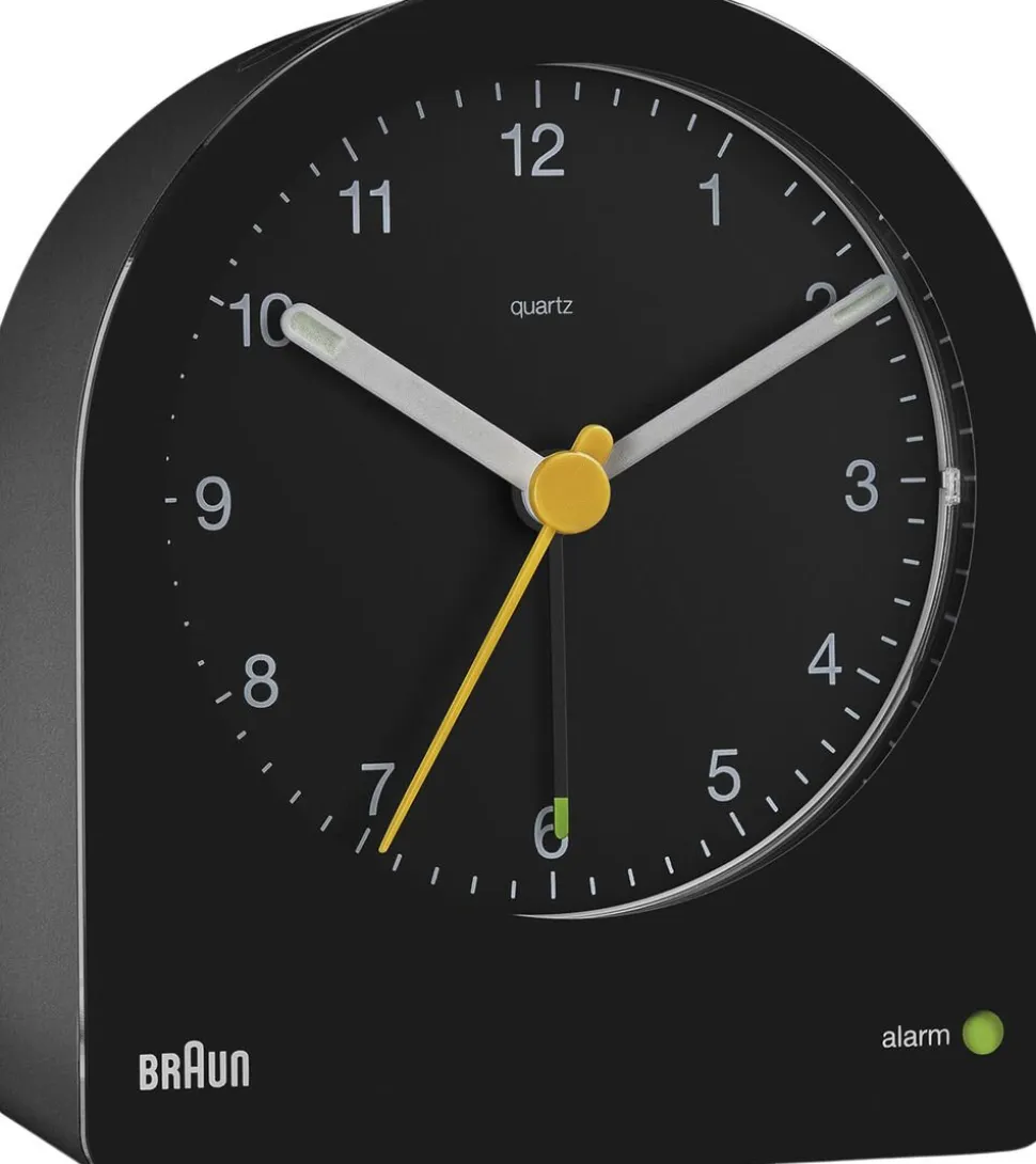 BC22 Classic Analog vækkeur er unik i formen. Dens silhuet er afledt af AB 2 uret designet i 1984 af Dieter Rams. Den rene, forsimplede urskive og kontrasterende visere med lysende spidser giver god læsbarhed. Tilføjelsen af ??den ikoniske gule second hand er synonym med Brauns prisvindende designhistorie og langvarige æstetik. Som med alle Braun-produkter lægges der vægt på at prioritere brugervenlighed og funktionalitet, og dette er perfekt illustreret af den kontinuerlige baggrundsbelysningsfunktion, der subtilt oplyser urskiven i omgivelser med svagt lys. Det diskrete baggrundsbelysning hjælper med at læse, hvilket resulterer i ubesværet læsning om natten. Denne funktion kan også deaktiveres af brugeren. Blandt dets funktioner er en snooze- og lysfunktion, samt en crescendo-bip-alarm, der når den er indstillet, er synlig på urskiven med en grøn indikator. BC22 er drevet af et kvartsværk, der sikrer, at uret er stille og præcist.