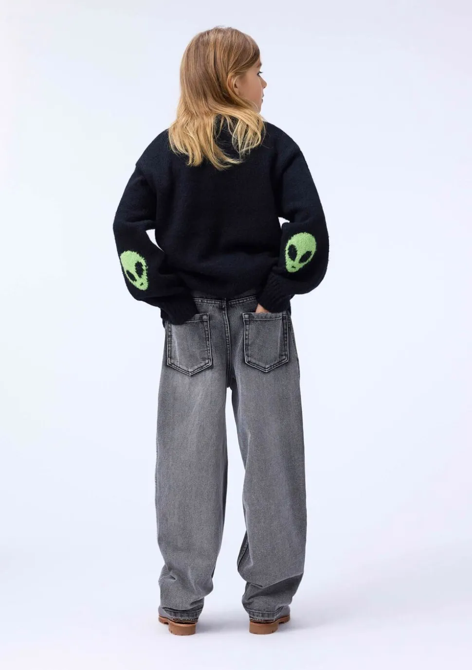 Denne sorte striktrøje fra Molo er lavet i en blød alpaka-uldblanding. Trøjen har en sjov detalje med vævede grønne alien på albuerne og ribstrik ved halsudskæringen, ærmerne og hofteområdet. Den har en almindelig pasform.