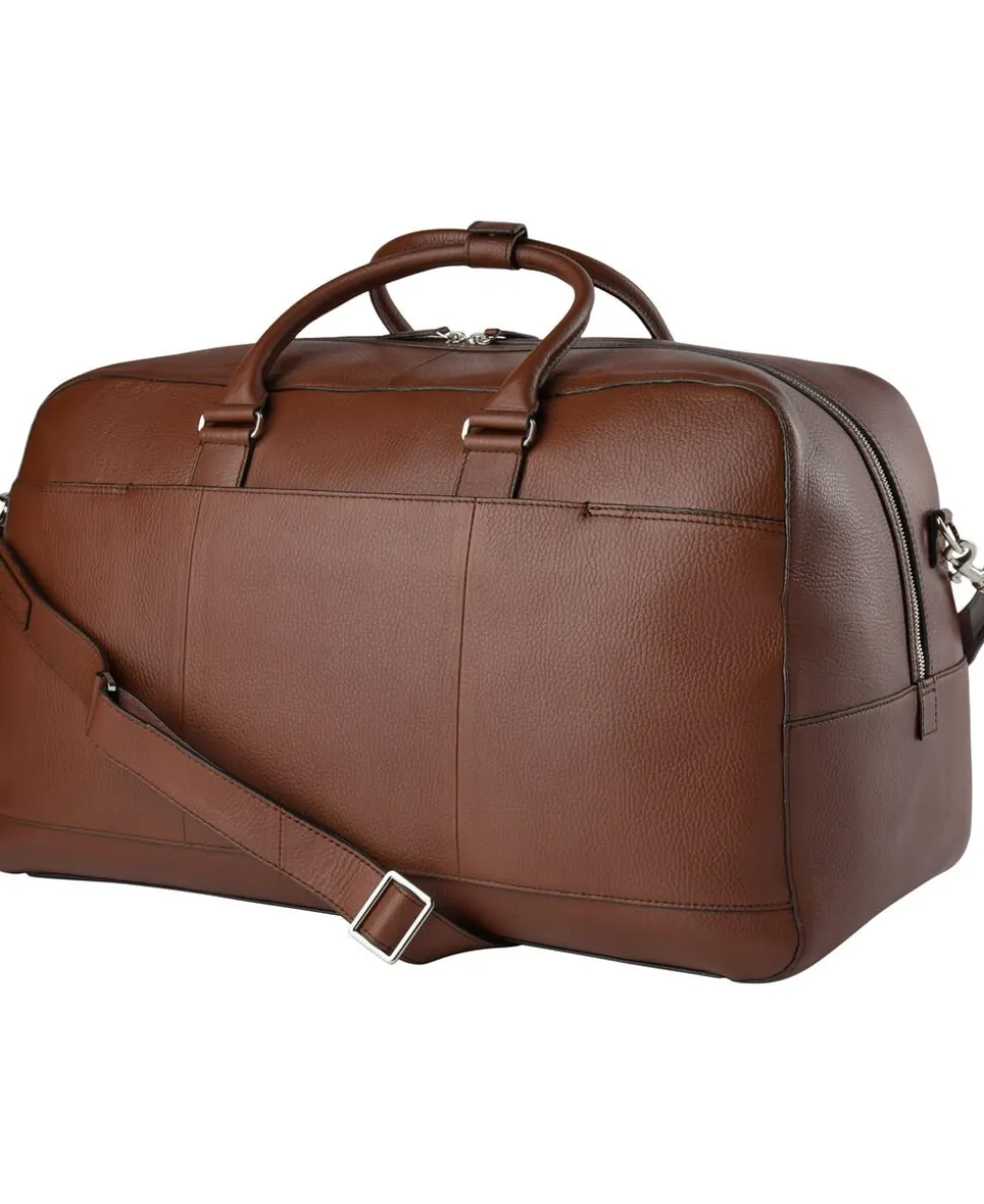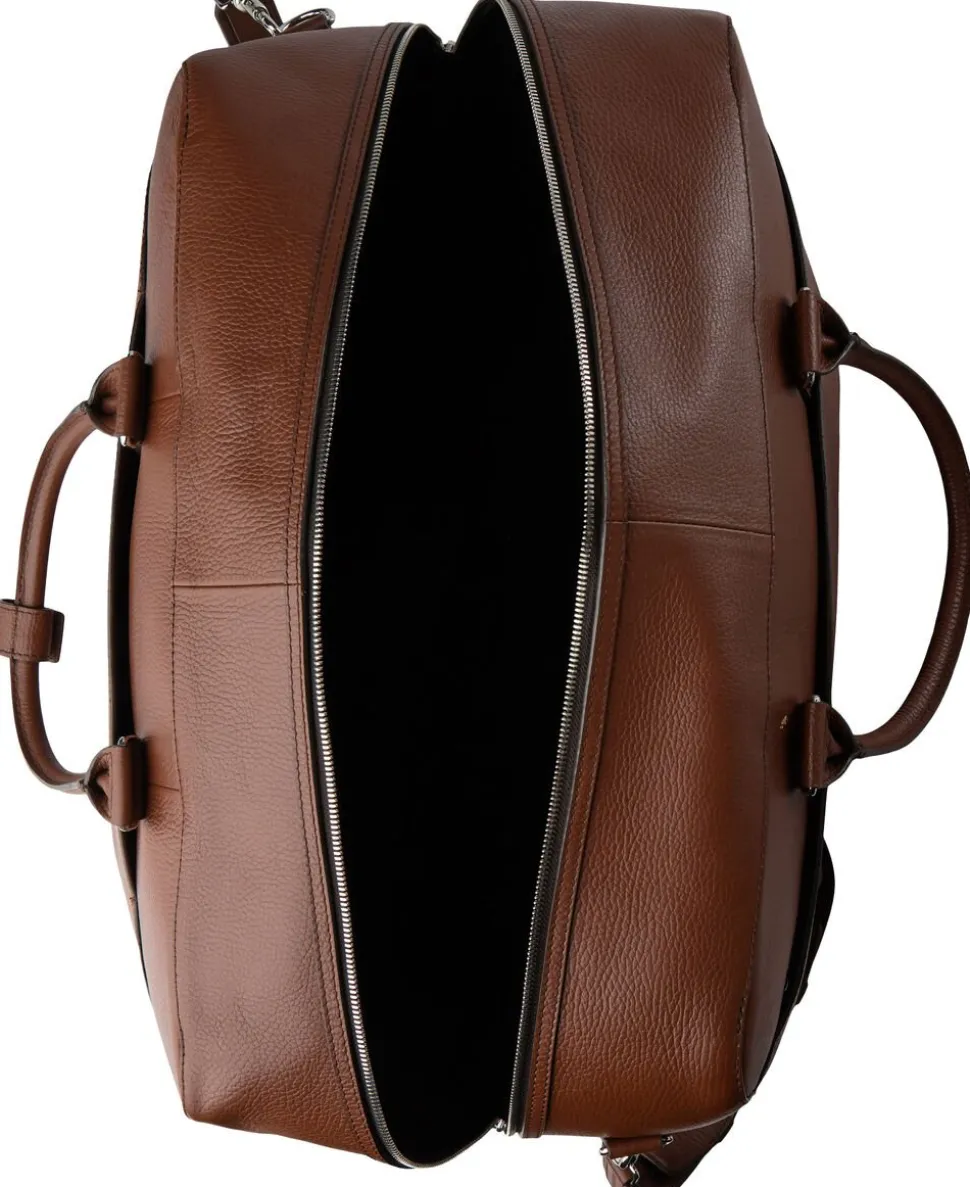 Weekend bag in soft grainy leather. Detachable shoulder strap, side handle and two-way zip at top. Zipped outside front pocket, trolley attachment strap at the back. Inside features one large zipped pocket and one open welt pocket. Embossed Tiger of Sweden logo at front. Size: 31.5 cm x 53 x 27 cm