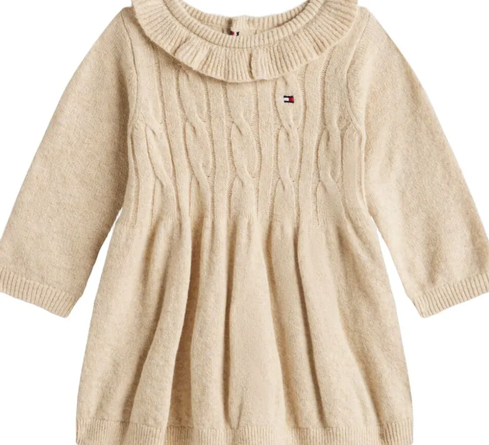 Denne kabelstrikkede kjole er et charmerende valg til de køligere måneder, den har en Peter Pan-krave og nederdel med svaj. Højdepunkterne omfatter en bomuldsblanding, kabelstrik på toppen, Peter Pan-krave, knaplukning på nakken, ribstrikket krave, manchetter og kant, Tommy Hilfiger-branding og Tommy Hilfiger-flag broderet på brystet. Shape & fit har en almindelig pasform, lange ærmer, strikkjole og design med pasform og svaj Design. Sammensætning og pleje: 55 % bomuld, 24 % nylon, 21 % akryl