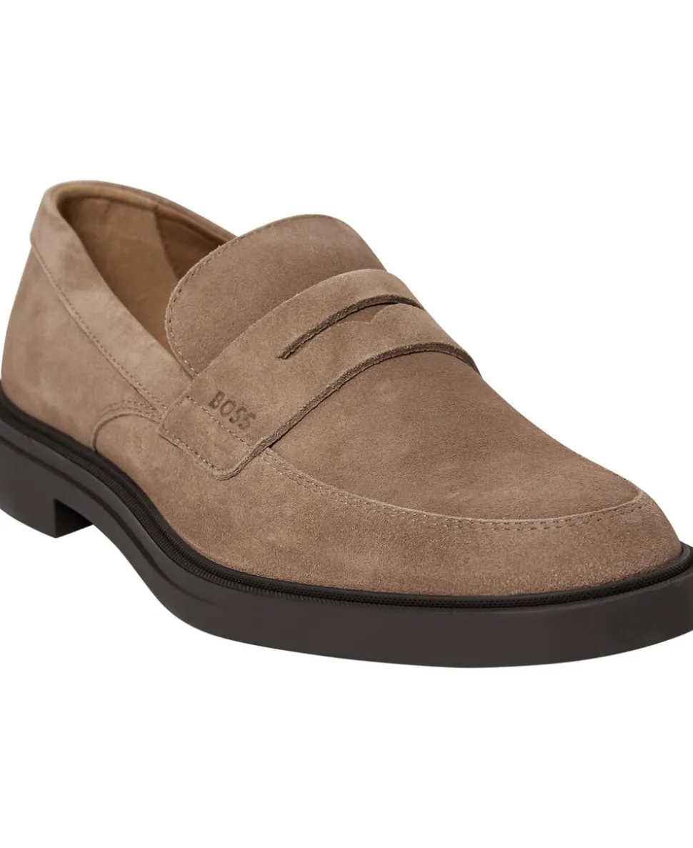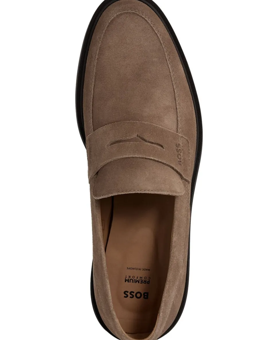 Featuring a classic penny trim with branding, these European-made BOSS Menswear loafers are shaped in soft suede. Durable rubber outsole. This product contains at least 80% better raw materials. The leather used to make this product has been sourced from certified tanneries.
