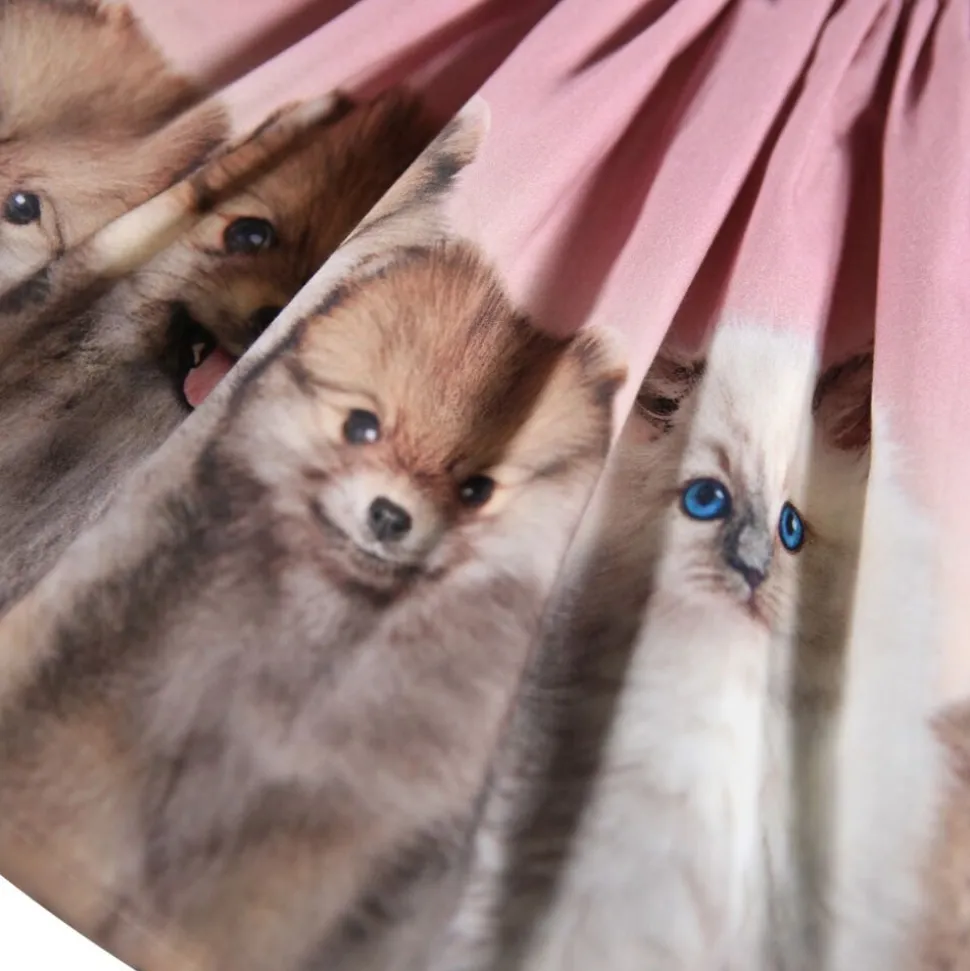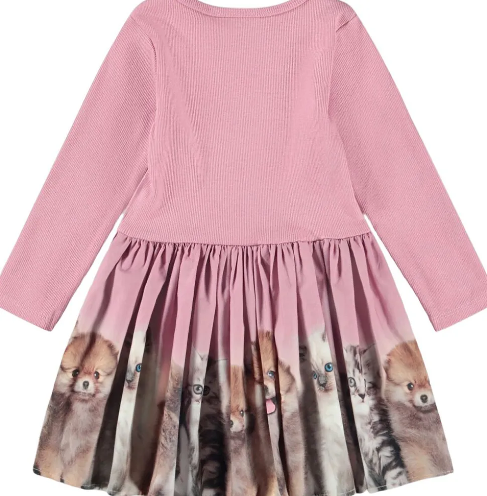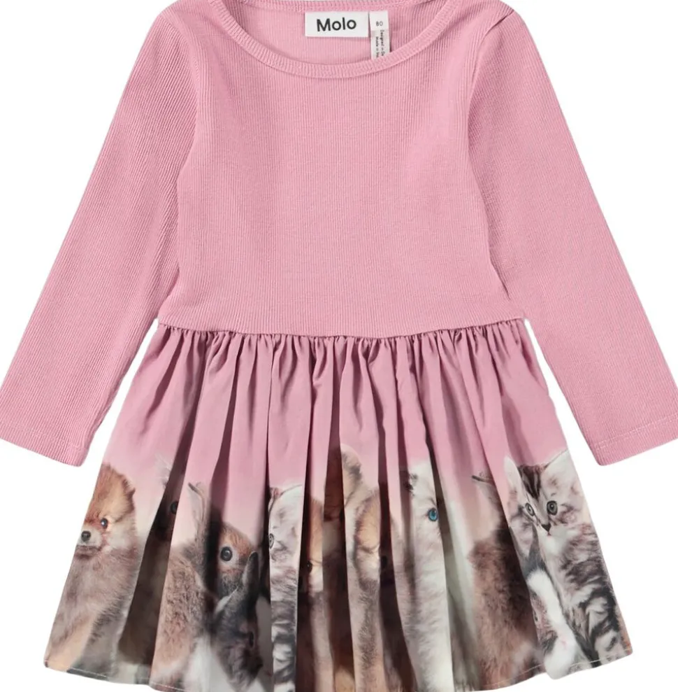 Denne kjole fra Molo er lavet i økologisk bomuldsjersey og har et blomsterprint. Toppen er tætsiddende i ribbet jersey, mens skørtet er i poplin, der giver kjolen volumen. Kjolen har knaplukning ved skulderen.