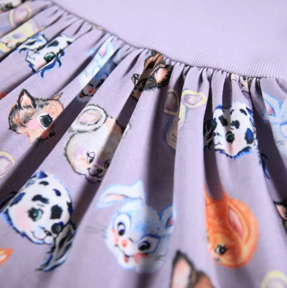 Denne kjole fra Molo er lavet i økologisk bomuldsjersey og har et print af nuttede dyr. Toppen er tætsiddende i ribbet jersey med en rund hals og knap på skulderen. Påsyet skørt med fin volumen.