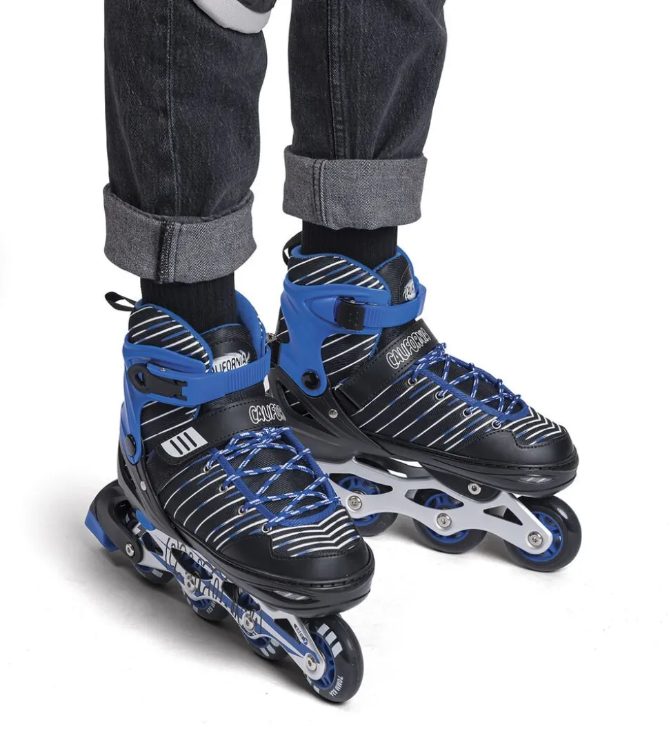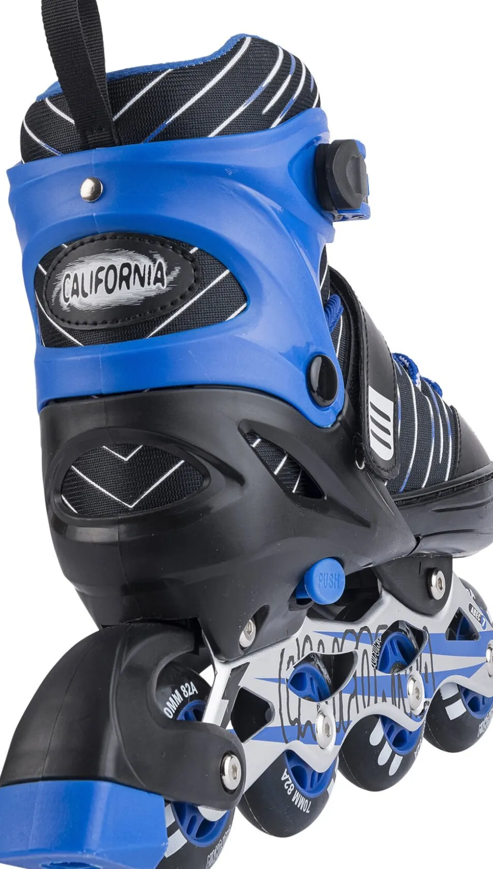 California justerbare inliners sort/blå Fleksible inliners der kan justeres i størrelserne 31-34, 35-38 eller 39-42 Specifikationer: Alu truck ABEC 7 kuglelejer 82A PU-gummihjul Snørebånd. spænde og velcrostrap Fleksibel indersok og sål Bremseklods 4 størrelser pr skøjte