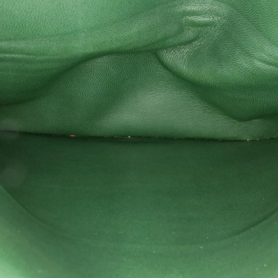 This shoulder bag features a quilted patent leather body, a leather woven chain link strap, double flaps with CC turn-lock closure, an exterior back slip pocket, and interior zip and slip pockets. Interior lining has been repainted. It carries a B+ condition rating. Exterior back cracked and creased. Exterior bottom worn. Lock scratched. Exterior corners worn. Embellishment scratched. Exterior front creased. Exterior handle worn. Interior lining repaired and worn. Practical attachment scratched. Exterior side cracked and creased. Exterior top worn. Zipper scratched.