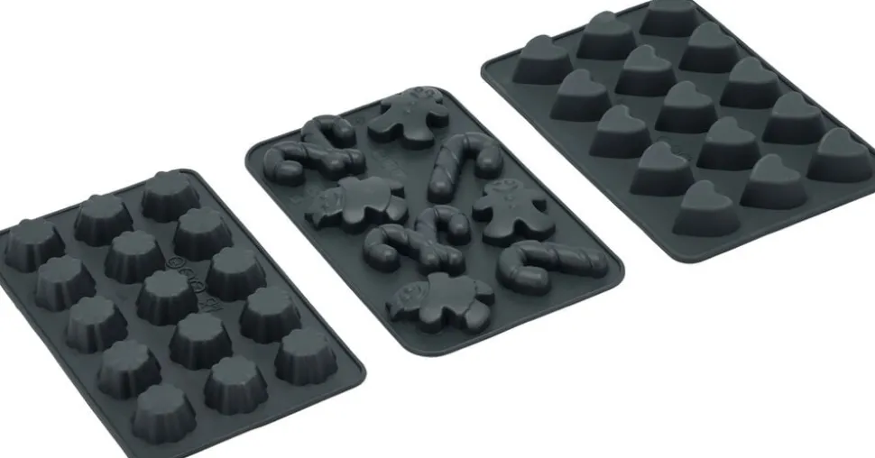 Chokoladeforme i grå silikone med 3 forskellige temaer, så du kan støbe de fineste, små chokoladefigurer. Formsættet giver 15 blomster, 15 hjerter og 8 søde julemotiver. Den bløde silikone gør det nemt at vende de støbte figurer ud af formene. Velegnet til opvaskemaskine og fryser ned til -20° C. 10,8 x 17,4 cm.