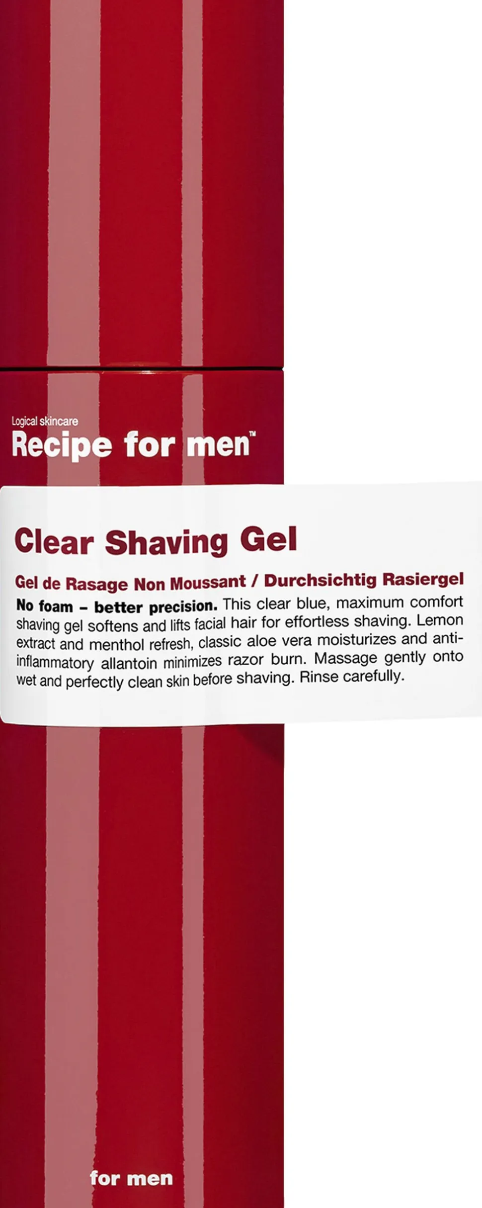 Recipe for men Clear Shaving Gel er en behagelig barbergel, som blødgør og får dine skægstubbe til at løfte sig, så du sikre dig en tæt barbering.