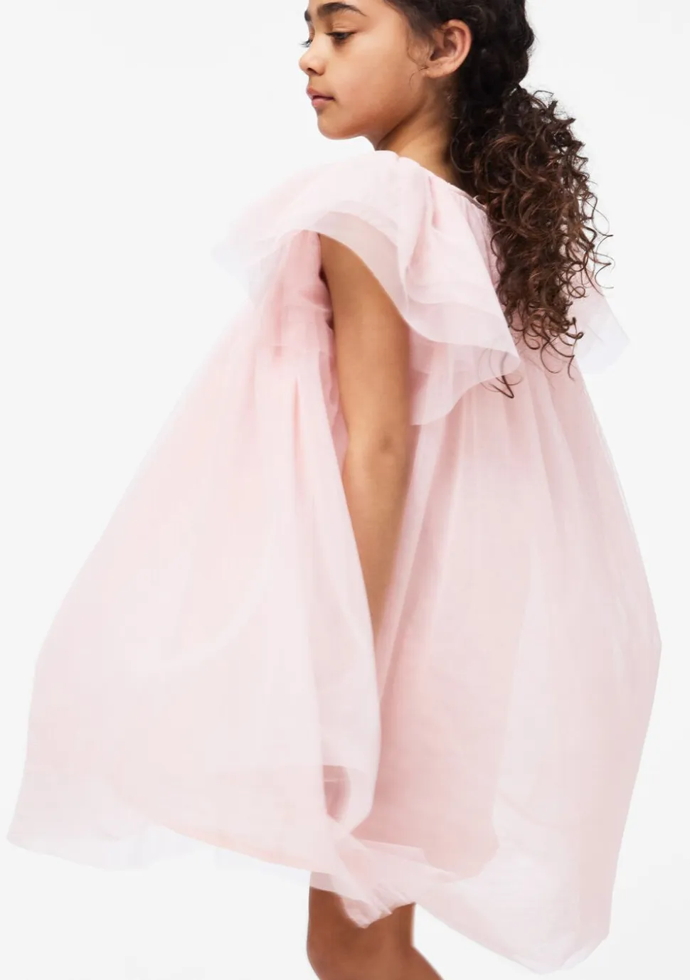 Knælang kjole i let tyl med fine plisseringer, der giver en skøn svaj i bevægelsen. De korte, transparente ærmer og det elegante bindebånd i nakken tilføjer en legende charme. Denne kjole er ideel til festlige anledninger, hvor dit barn vil føle sig både komfortabelt og stilfuldt på samme tid. Perfekt til sommerfester og sjove udendørs aktiviteter.