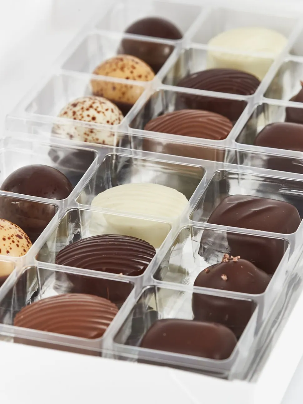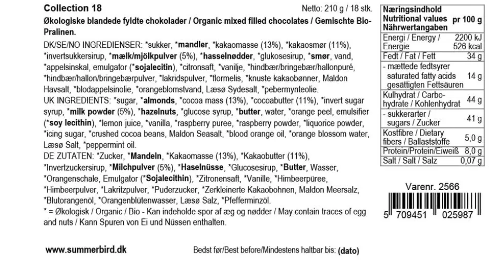 Collection 18 indeholder 9 forskellige varianter af vores raffinerede, klassiske fyldte chokolader. Æsken byder delikat velsmag i form af blandt andet marcipan af stenvalsede middelhavsmandler, praliné, mynte og karamel.