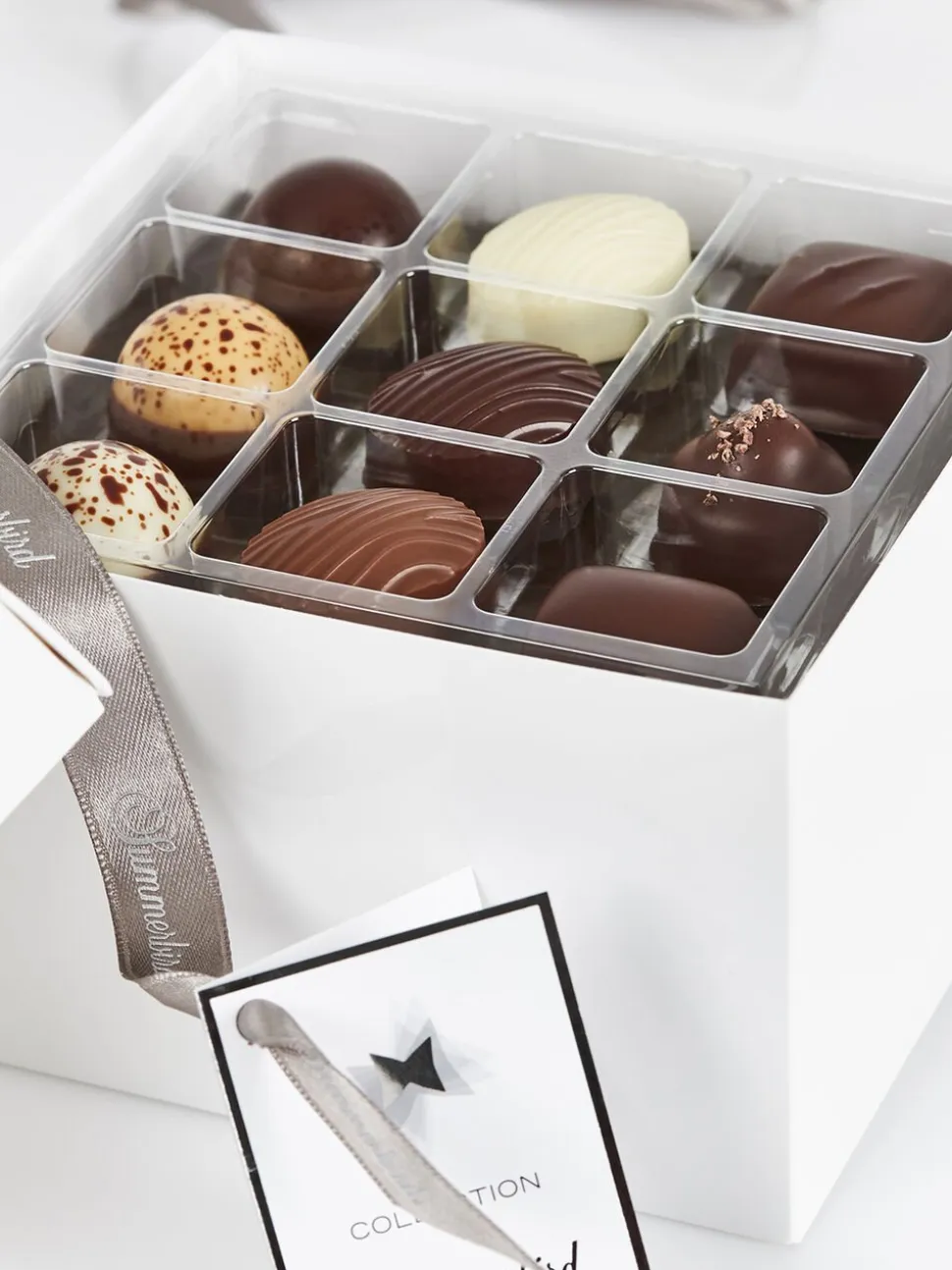 Gaveæsken indeholder 9 forskellige varianter af vores raffinerede, klassiske fyldte chokolader. Æsken byder delikat velsmag i form af blandt andet marcipan af stenvalsede middelhavsmandler, praliné, mynte og karamel.